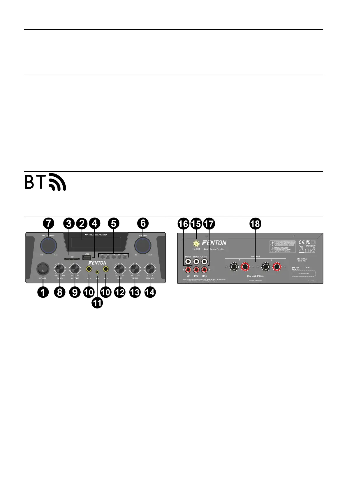 En mode FM/BT: maintenez cette touche enfoncée pour diminuer le volume.