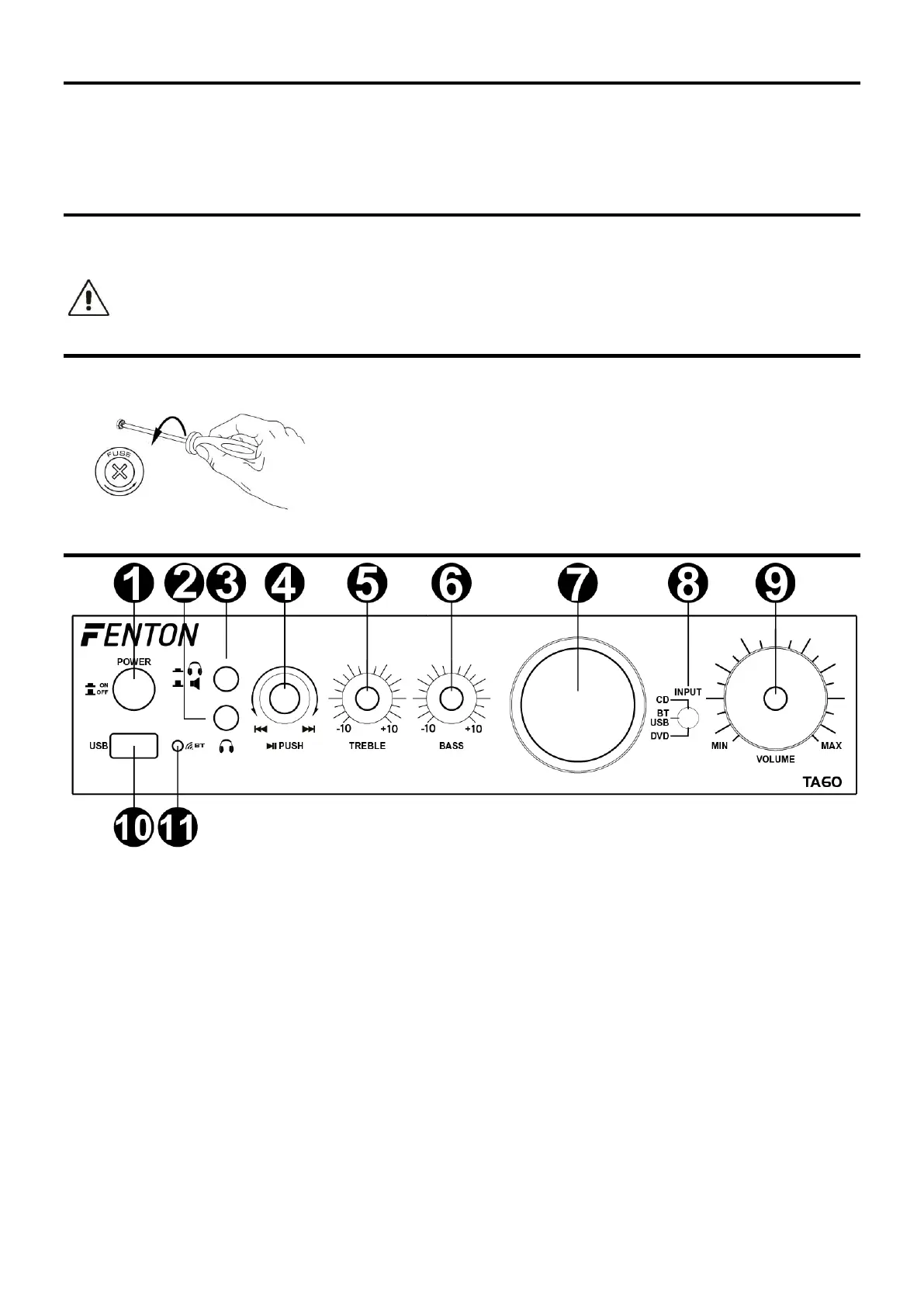 8. SÉLECTEUR D'ENTRÉE: Il y a 3 positions d'entrée différentes : CD, BT/USB et DVD. En mode BT/USB, l'appareil est