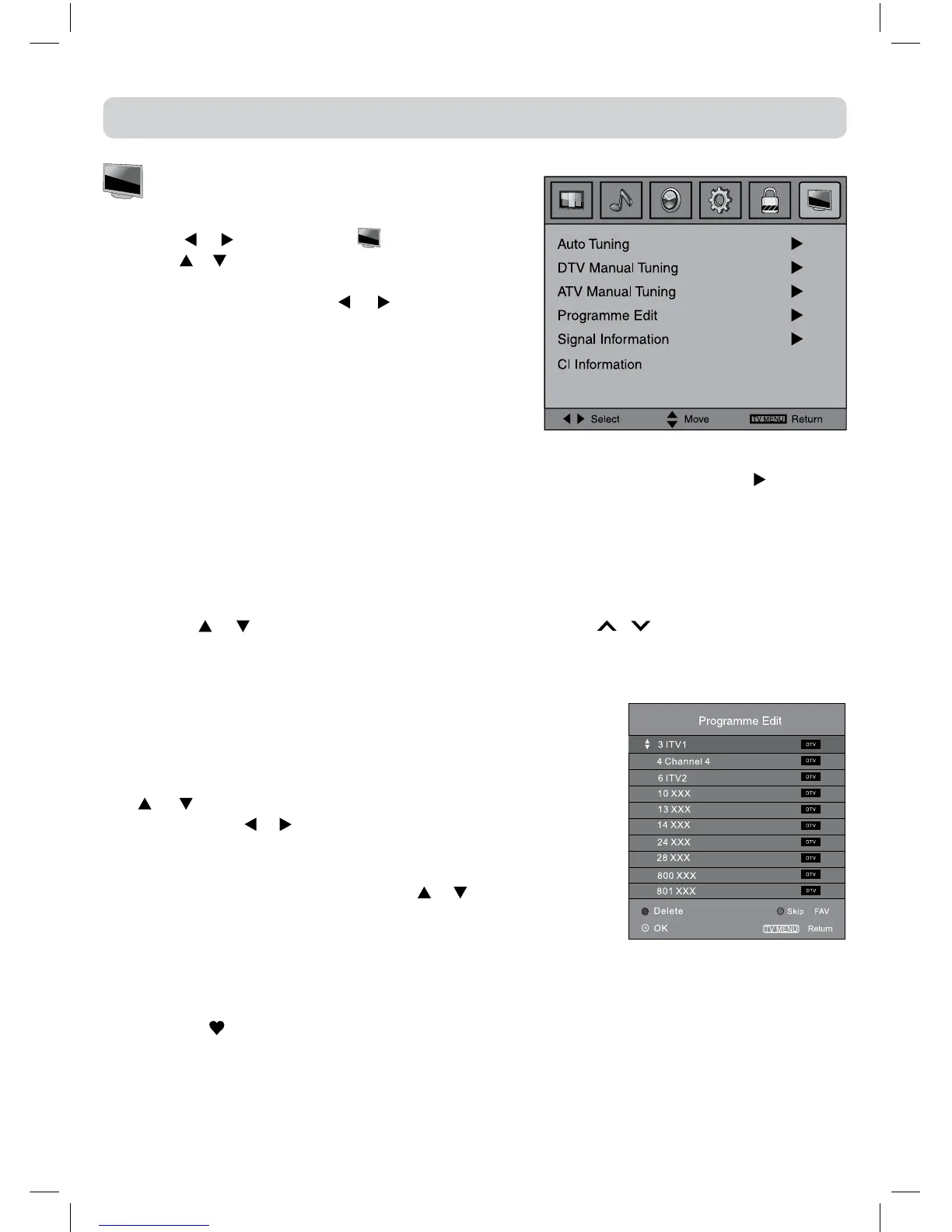 • ProgrammeEdit:AllchannelsstoredarelistedintheProgrammeEditmenu,youcaneditthe