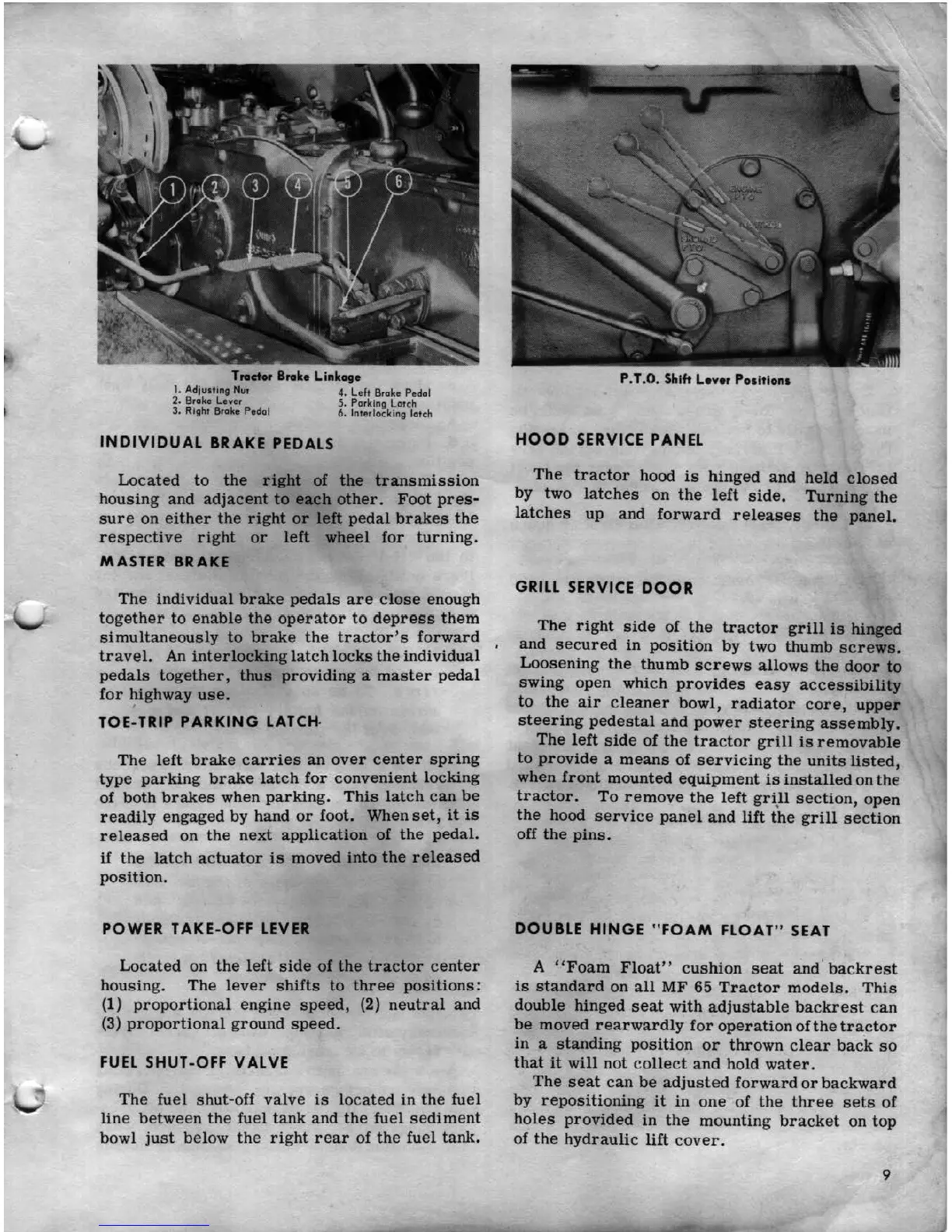 Ferguson MF 65 - Tractor Brake Linkage; Shift Lever Positions; Grill Service Door; Double Hinge Foam Float” Seat