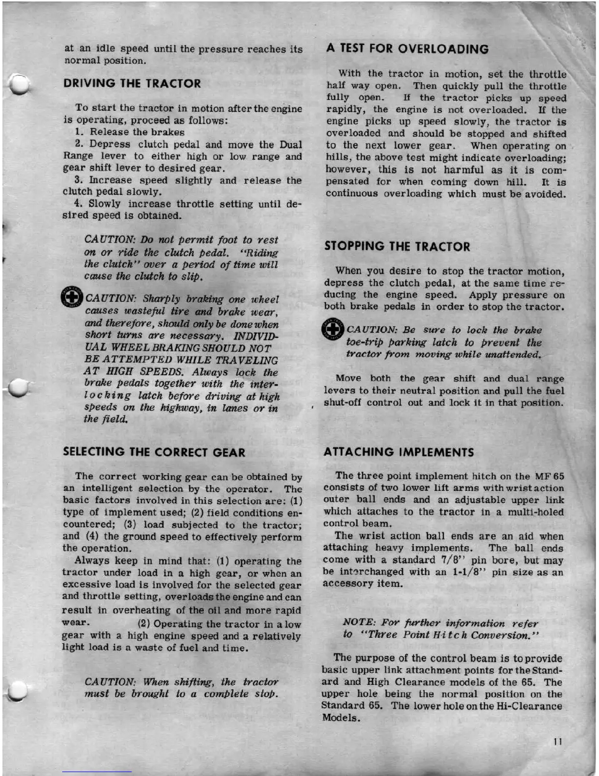 Ferguson MF 65 - Driving the Tractor; Selecting the Correct Gear; Stopping the Tractor; Attaching Implements