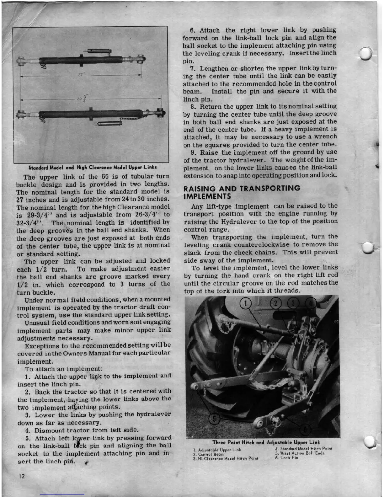 Ferguson MF 65 - Standard Model and High Clearance Model Upper Links; Raising and Transporting Implements