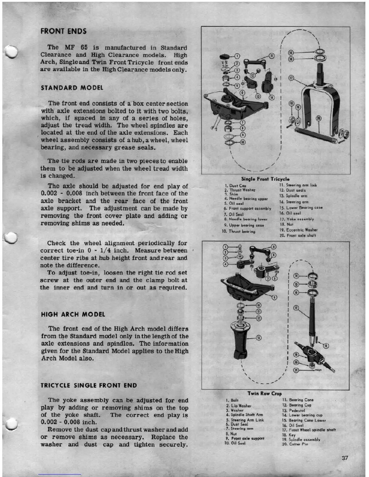 Ferguson MF 65 - Front Ends; Standard Model; High Arch Model; Tricycle Single Front End