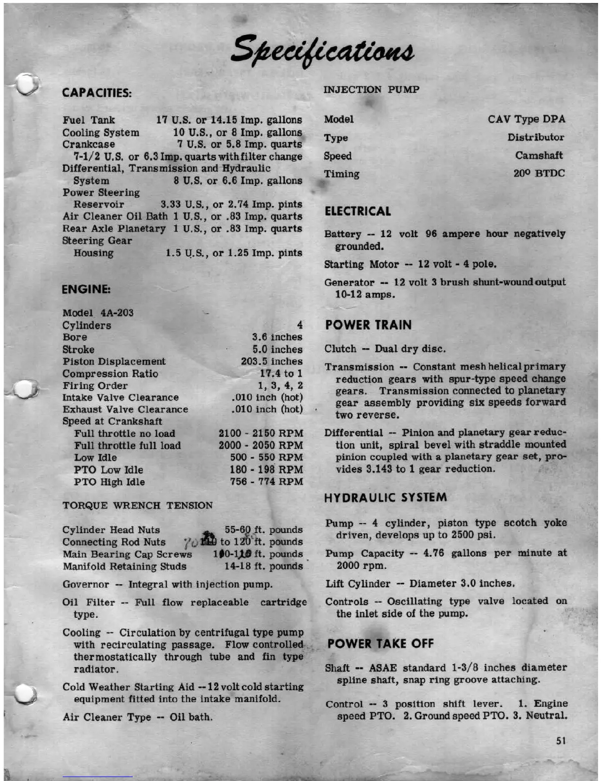 Ferguson MF 65 - Specifications; ENGINE AND FUEL SYSTEM SPECIFICATIONS; POWER TRAIN AND HYDRAULIC SYSTEM SPECIFICATIONS