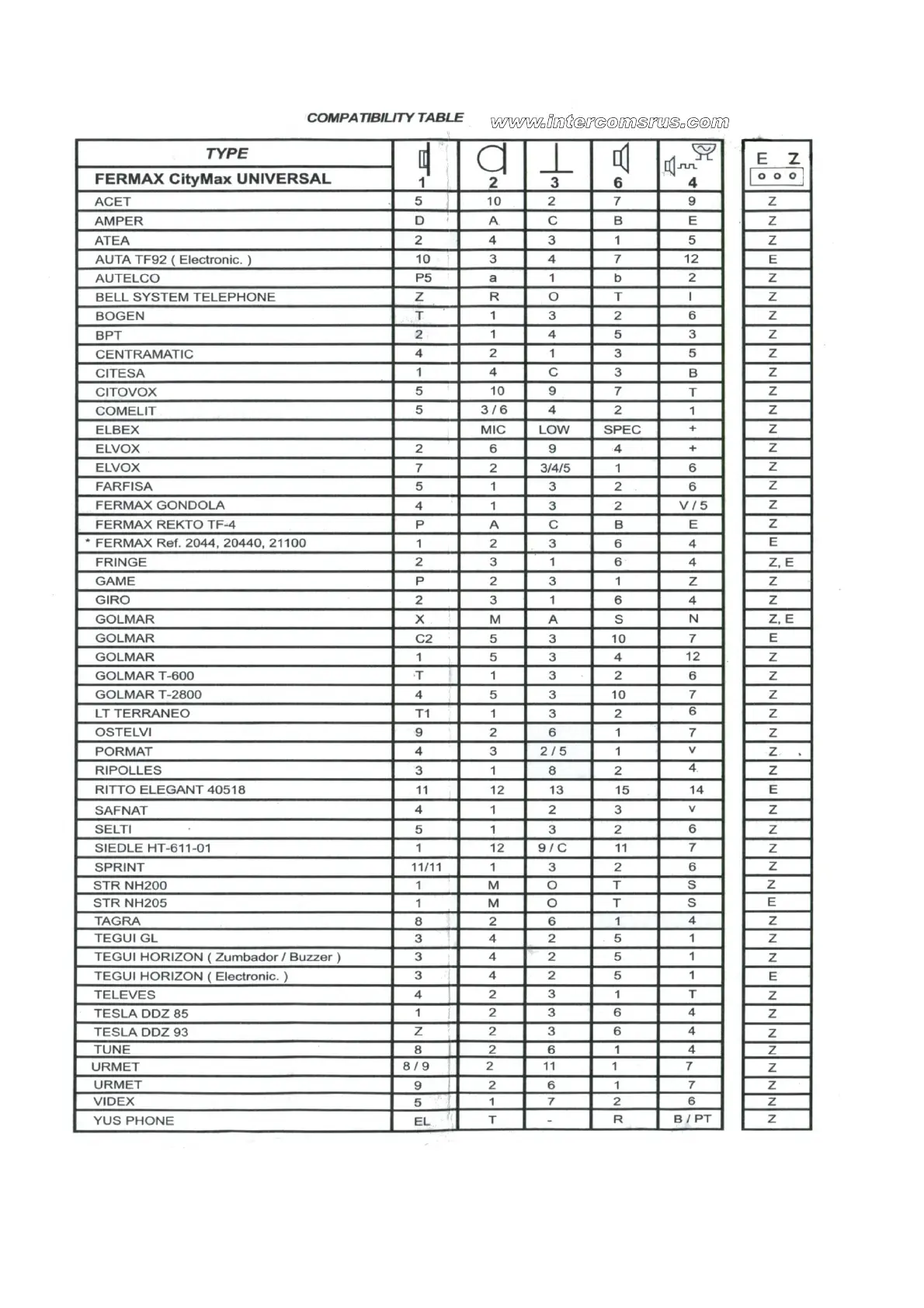 Fermax Citymax Universal - COMPATIBILITY TABLE