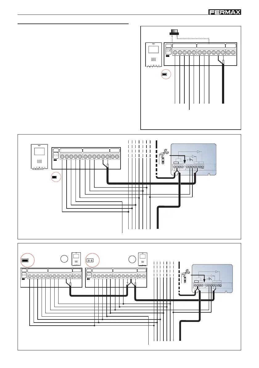 T, - : Conexión pulsador de llamada puerta vivienda (P1).