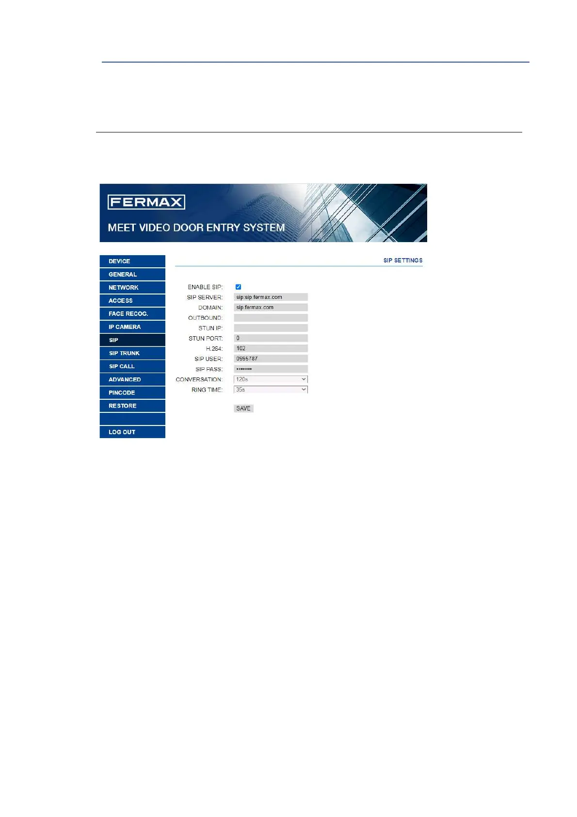SIP USER, SIP PASWORD: Indicate the user and password of the FERMAX MEET ME licence
