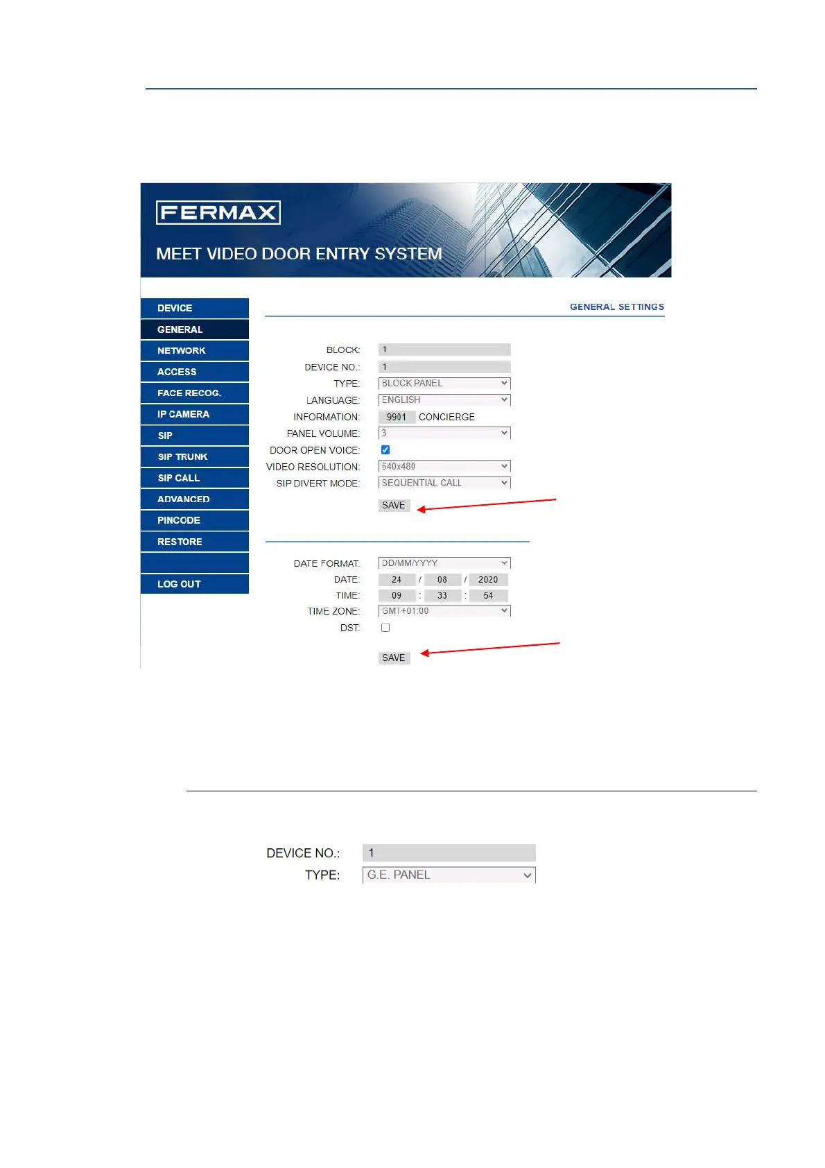 • DEVICE NUMBER: Number assigned to the general entrance where this panel is