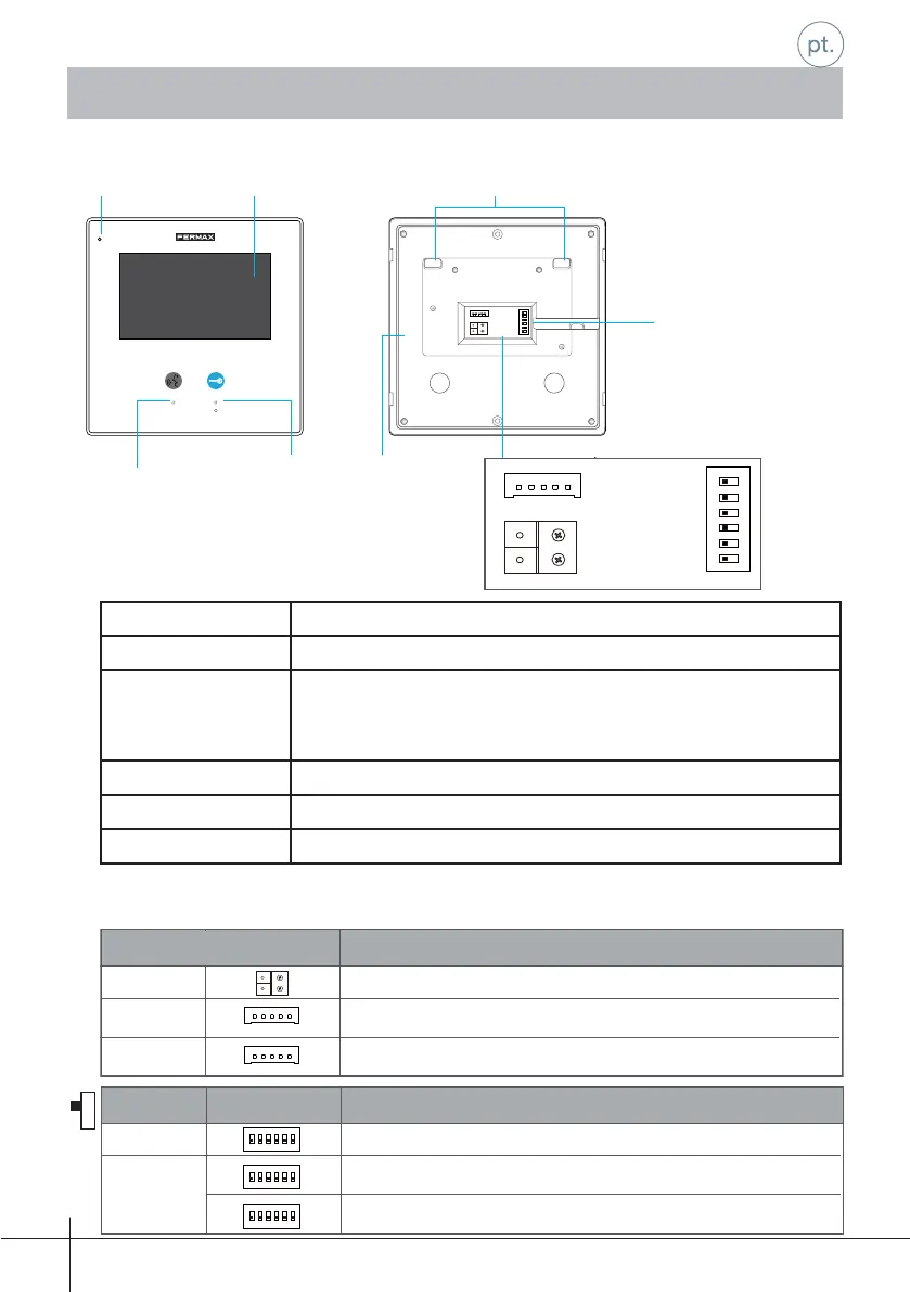 Conectores Terminais do bus, campainha da porta e dipswitches.