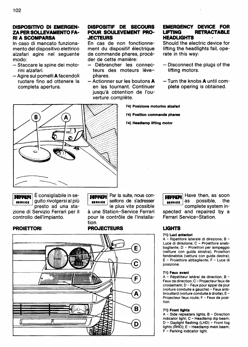 Ferrari 412 - Emergency Device for Lifting Retractable Headlights; Lights