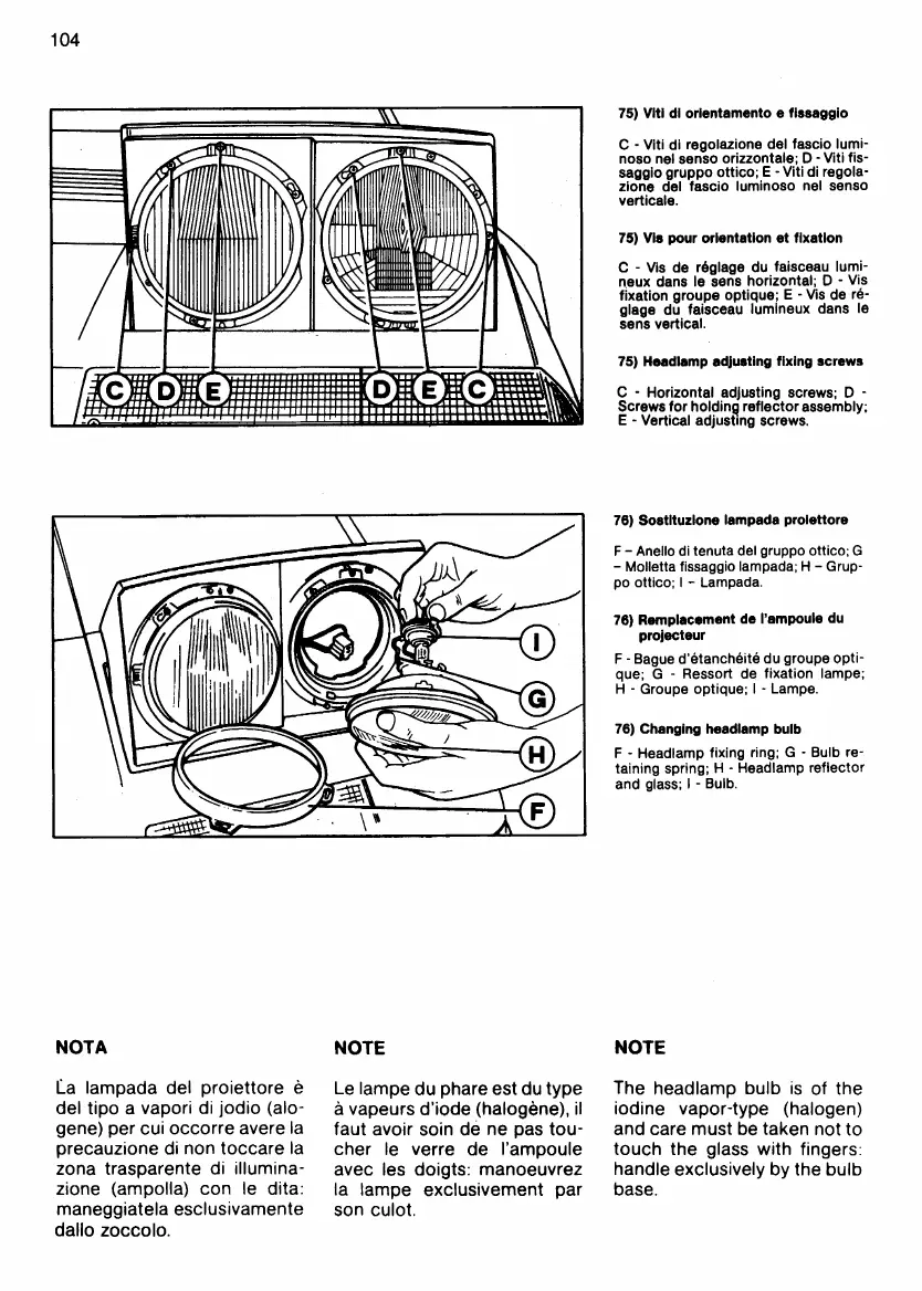 Ferrari 412 - Headlamp Adjusting Fixing Screws; Changing Headlamp Bulb