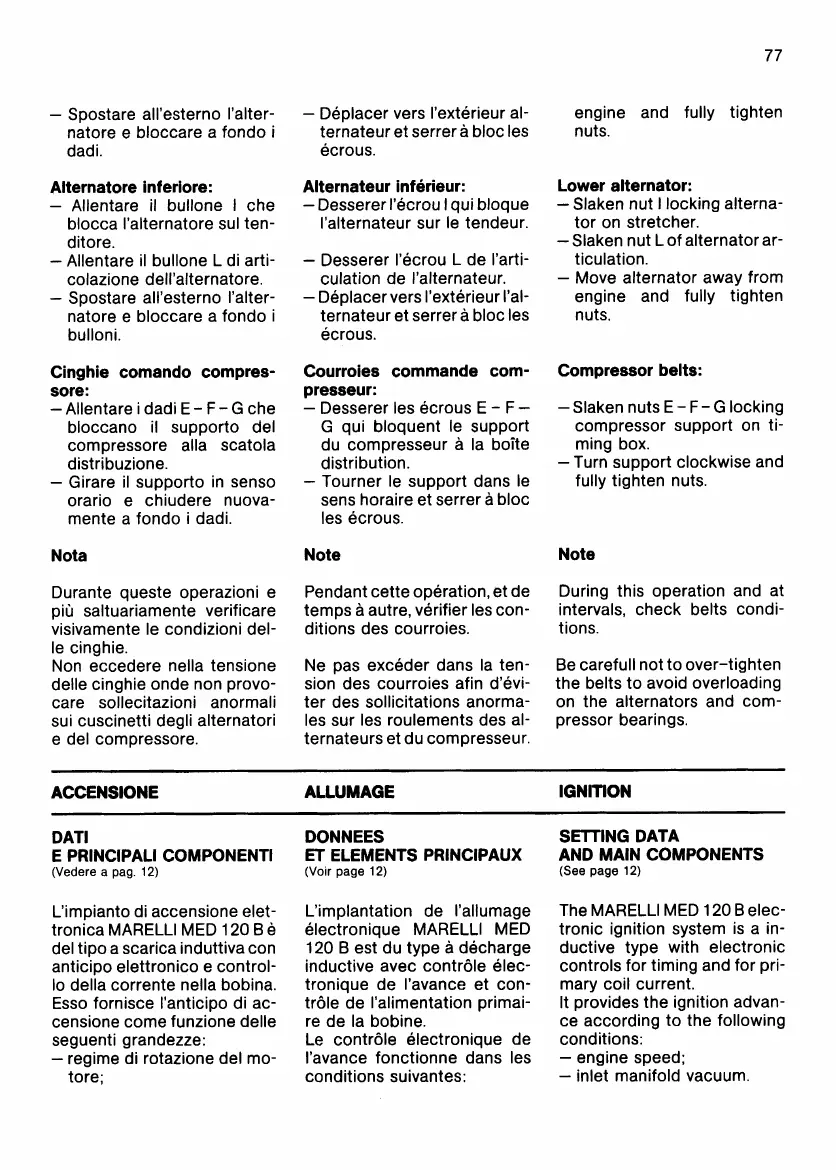 Ferrari 412 - Ignition; Setting Data and Main Components; Lower Alternator; Compressor Belts