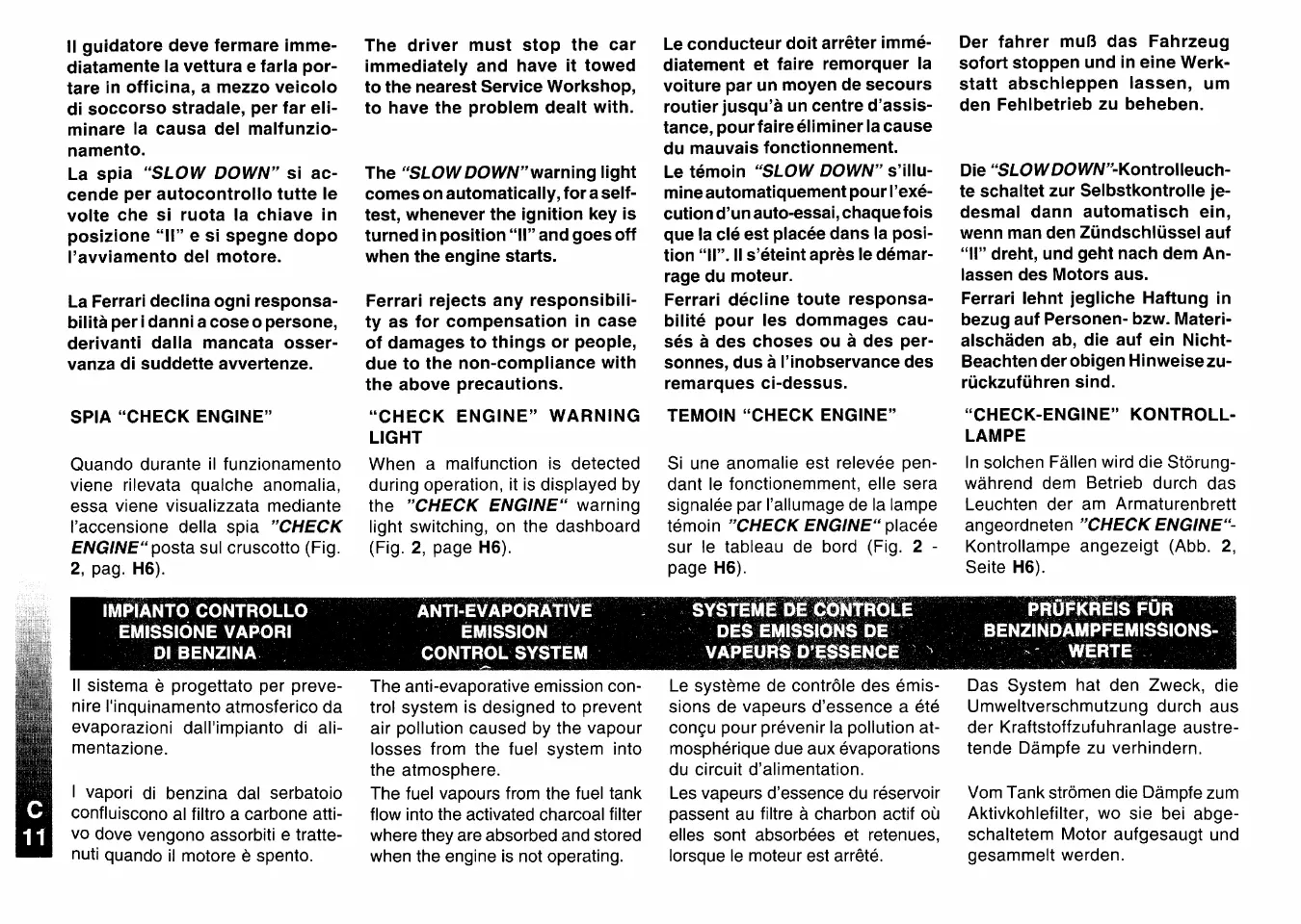 Ferrari 456M - Anti-Evaporative Emission Control System; Check Engine Warning Light