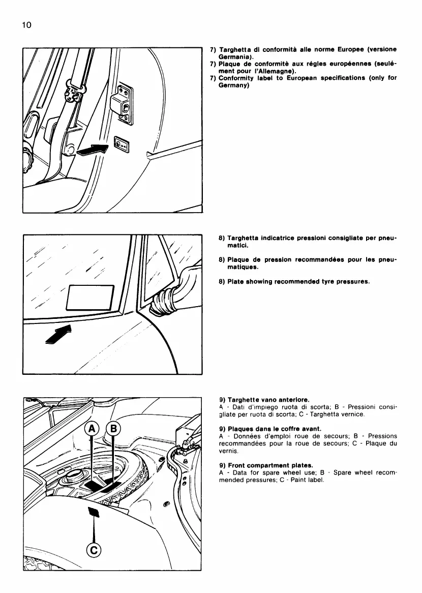 Ferrari 512 BB - Conformity Label to European Specifications (Germany); Plate Showing Recommended Tyre Pressures; Front Compartment Plates