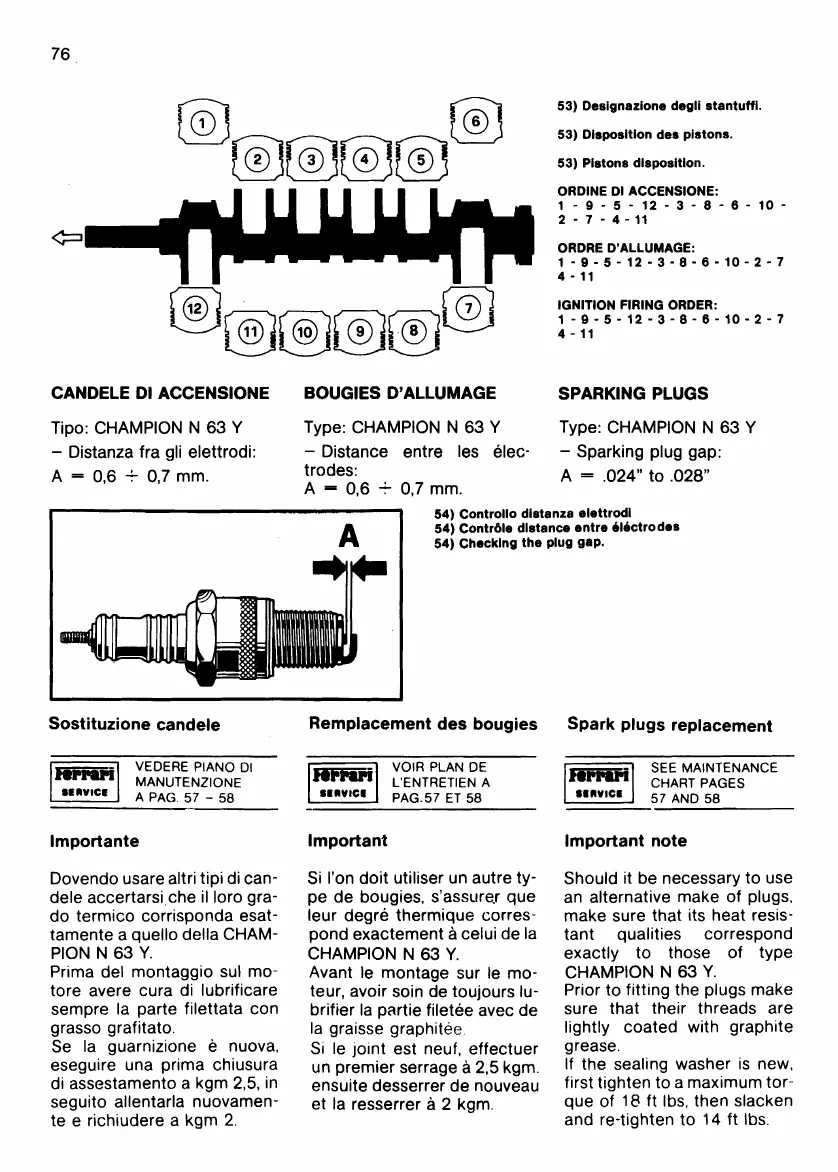Ferrari 512 BB - Sparking Plugs Data; Spark Plugs Replacement