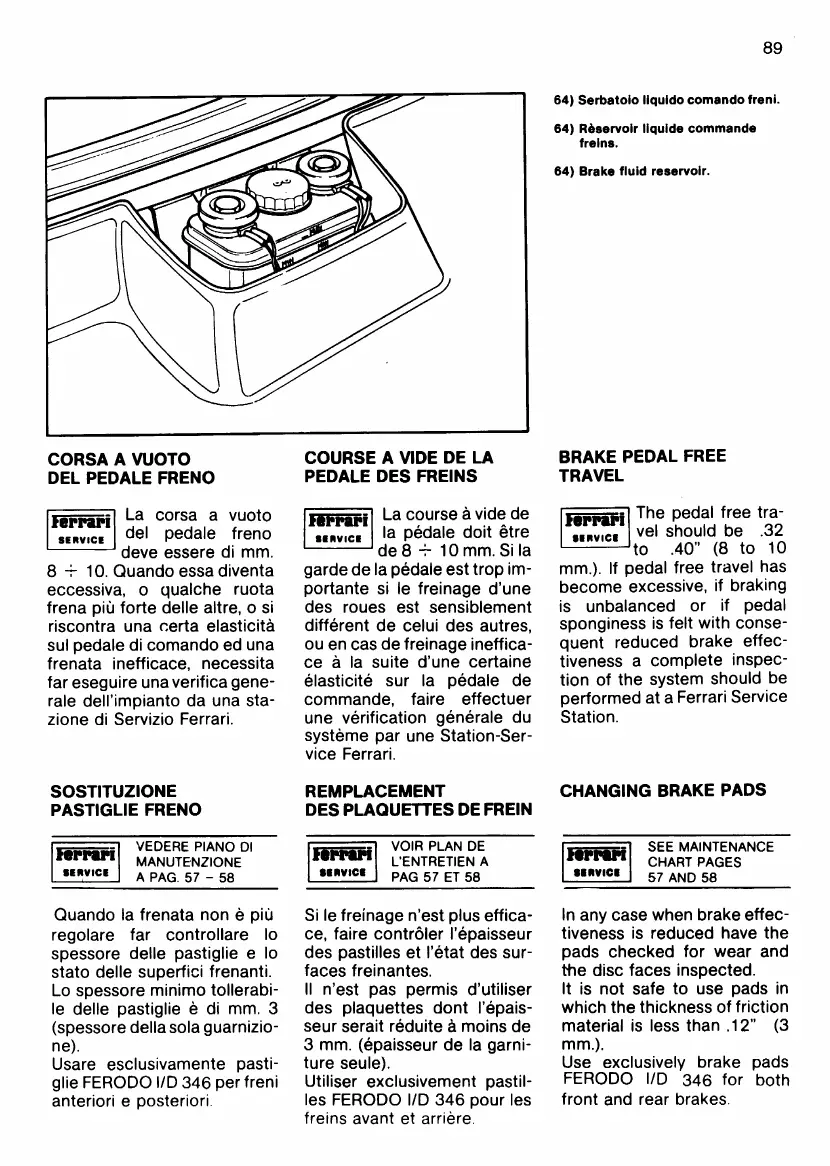 Ferrari 512 BB - Brake Pedal Free Travel; Changing Brake Pads