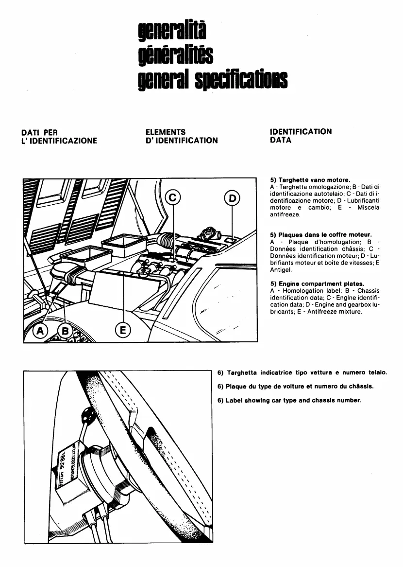 Ferrari 512 BB - General Specifications; Identification Data; Engine Compartment Plates; Label Showing Car Type and Chassis Number