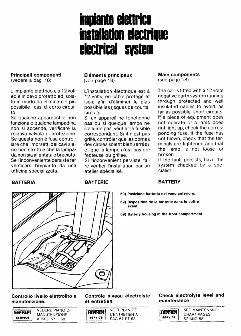 Ferrari 512 BB - Electrical System; Battery; Checking Electrolyte Level and Maintenance