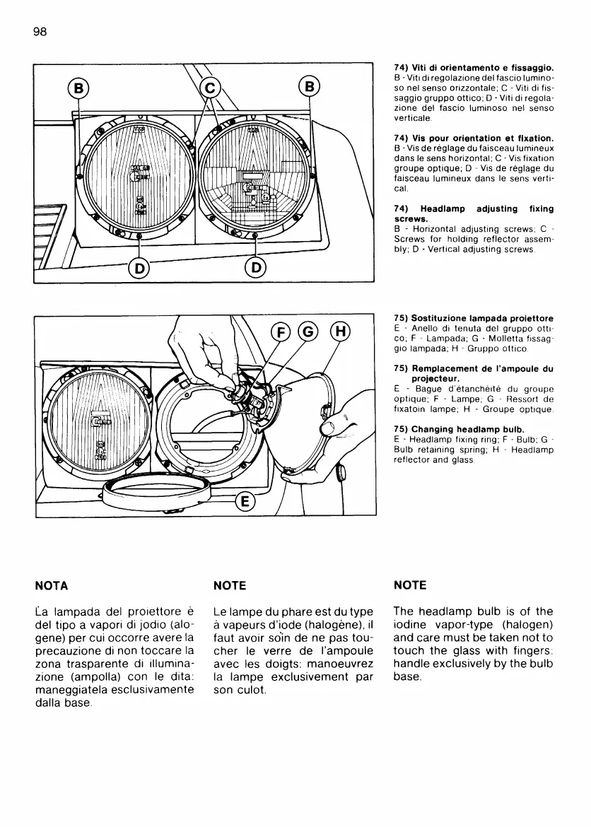 Ferrari 512 BB - Headlamp Adjusting Fixing Screws; Changing Headlamp Bulb