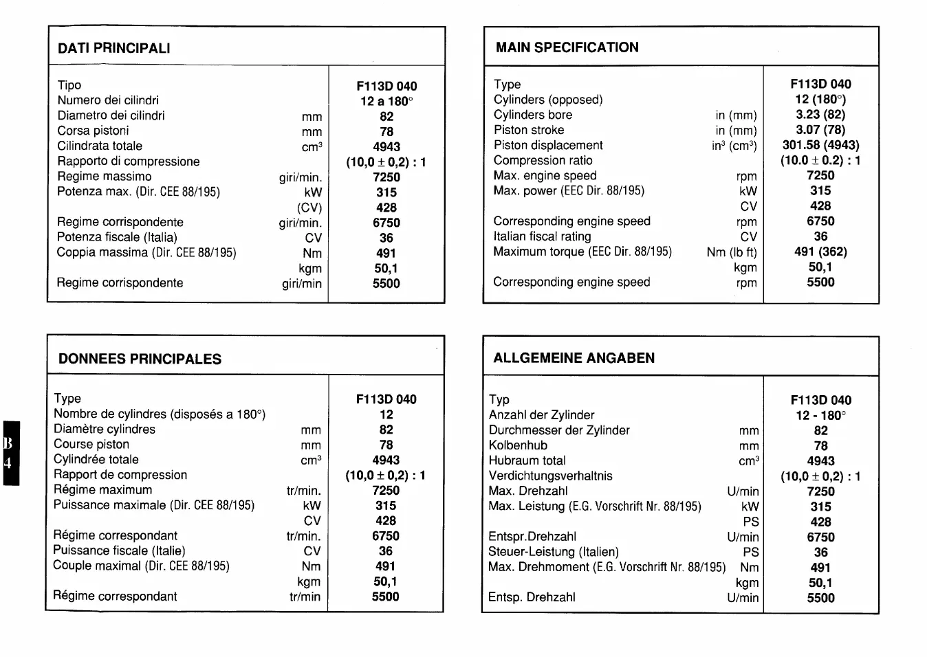 Ferrari 512 TR testarossa - dati principali; main specification; caractéristiques principales; allgemeine angaben