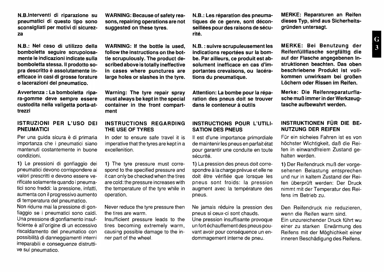 Ferrari 512 TR testarossa - istruzioni per luso dei pneumatici; instructions regarding the use of tyres; instructions pour l’utilisation des pneus; instruktionen für die renutzung der reifen