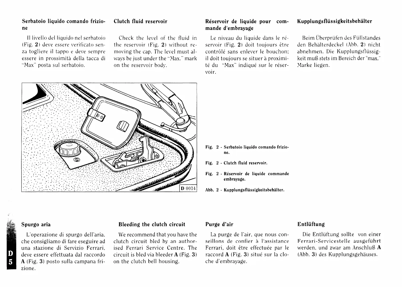 Ferrari F355 berlinetta - serbatoio liquido comando frizione; spurgo aria; clutch fluid reservoir; bleeding the clutch circuit