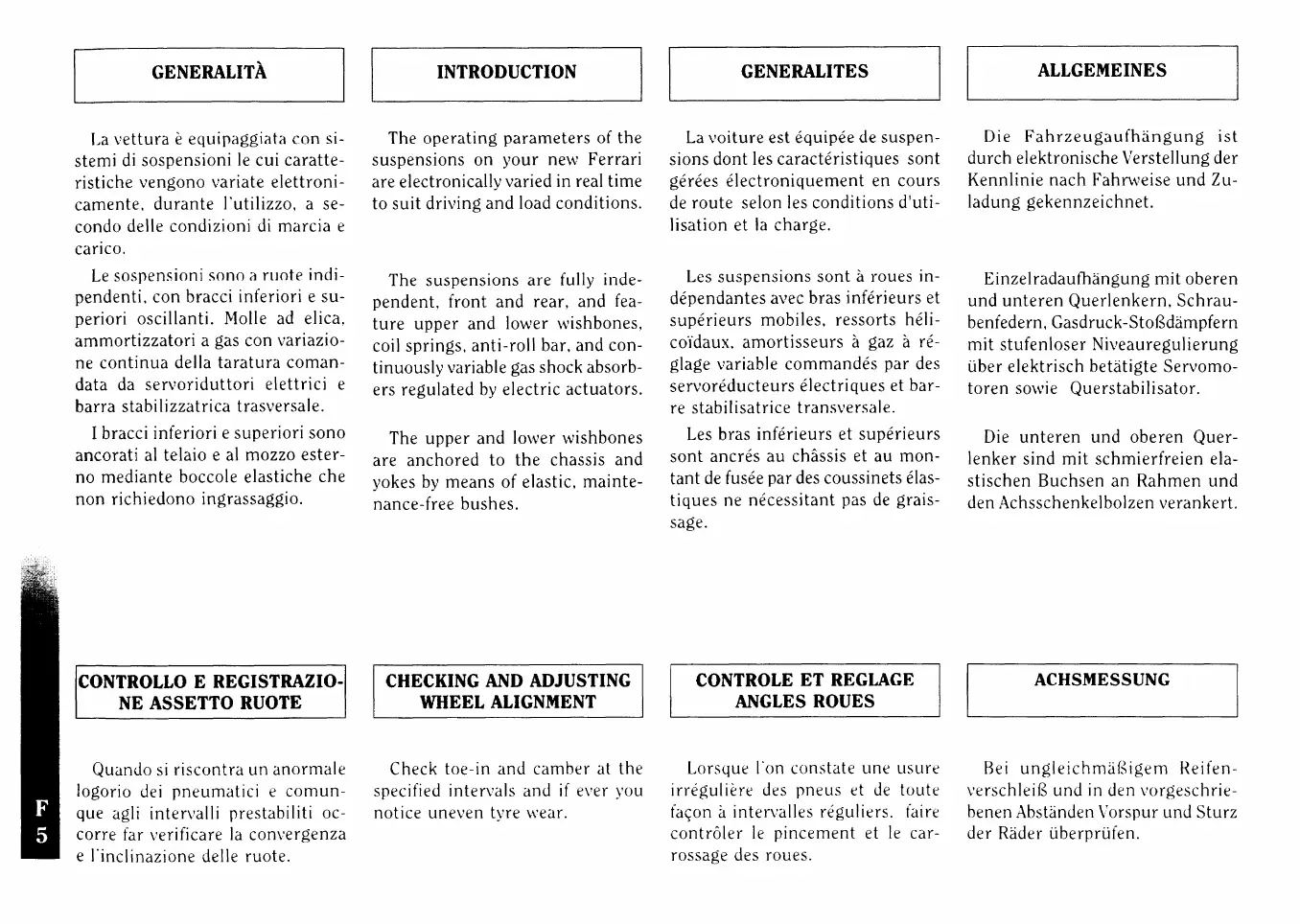 Ferrari F355 berlinetta - generaiità; controllo e registrazione assetto ruote; introduction; checking and adjusting wheel alignment