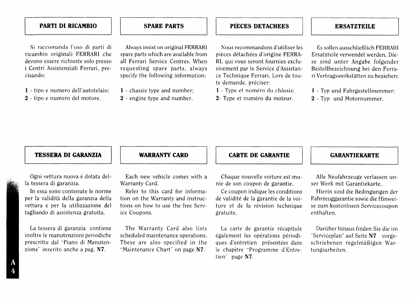 Ferrari F355 berlinetta - parti di ricambio; tessera di garanzia; spare parts; warranty card