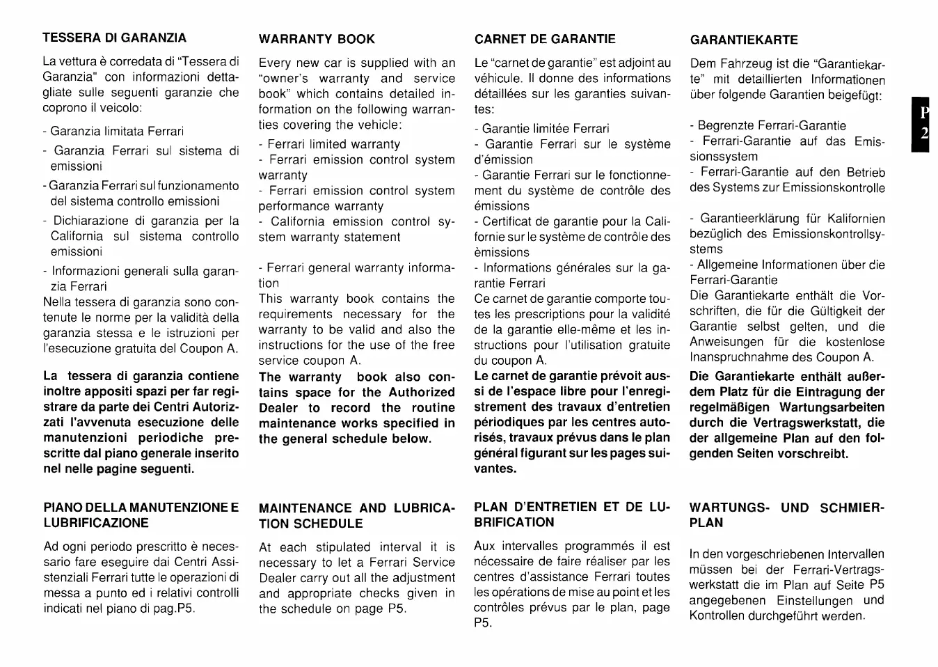 Ferrari F40 - Warranty Book; Maintenance and Lubrication Schedule