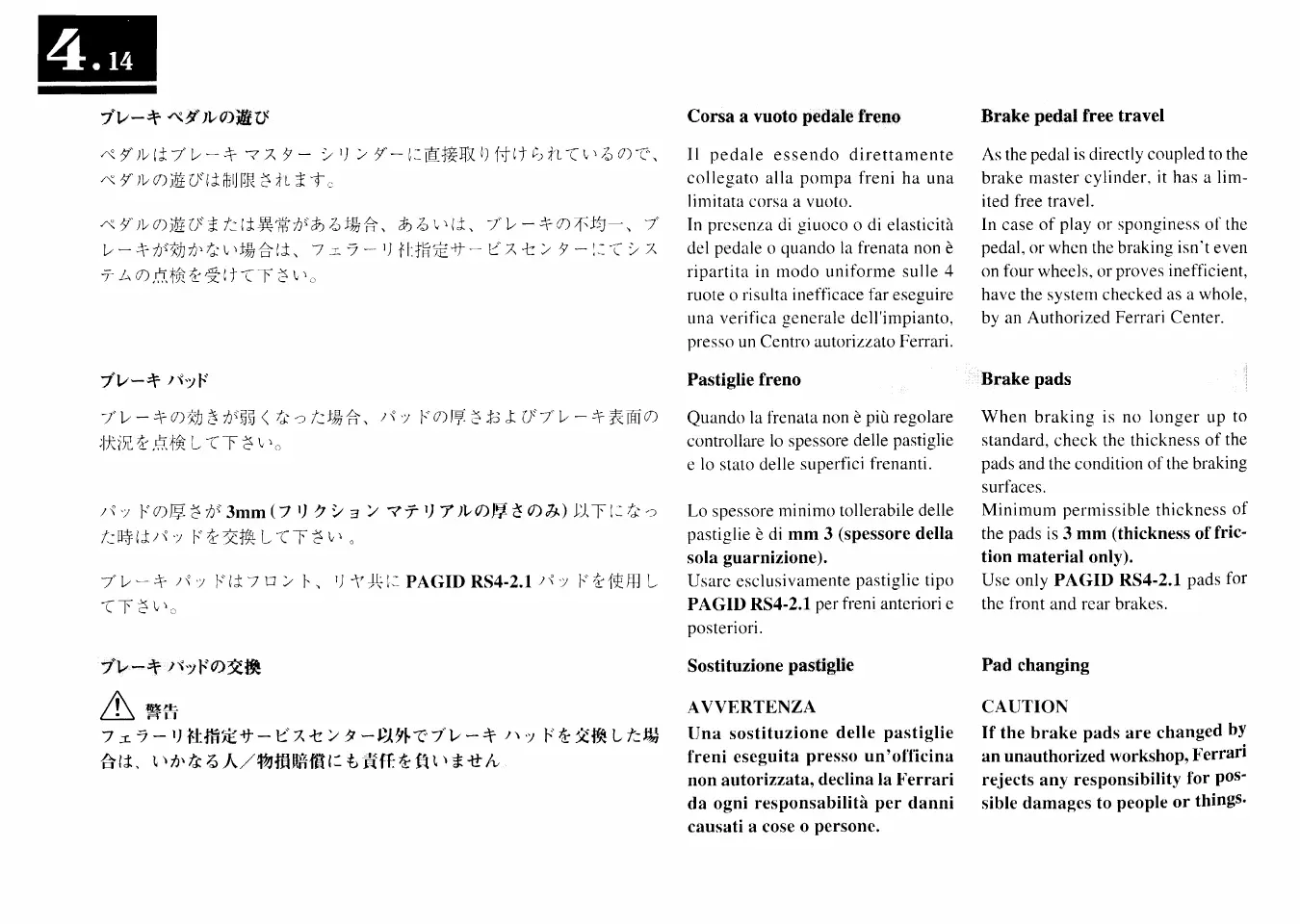 Ferrari F50 - Brake Pedal Free Travel; Brake Pads; Pad Changing