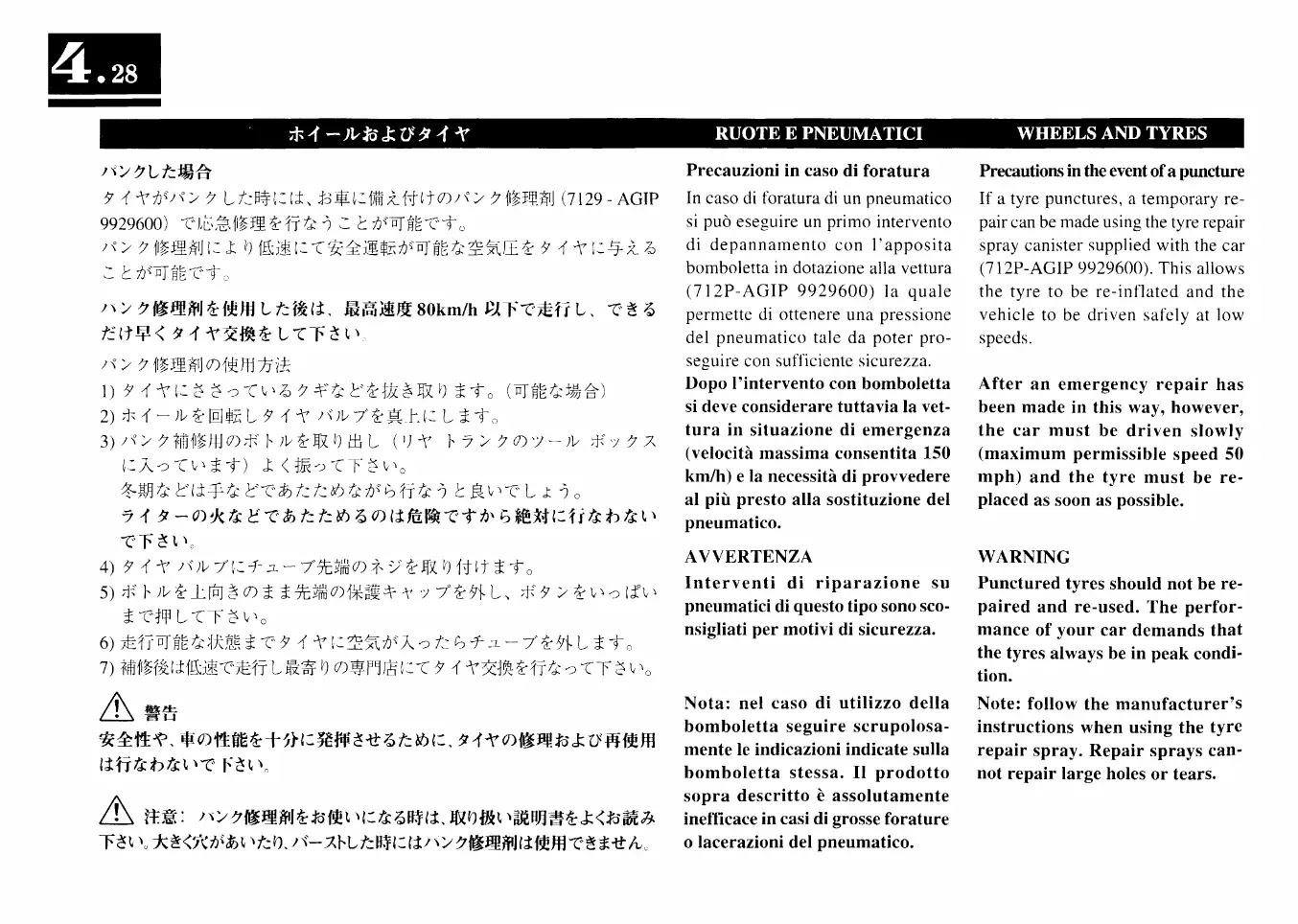 Ferrari F50 - Wheels and Tyres; Precautions in the Event of a Puncture