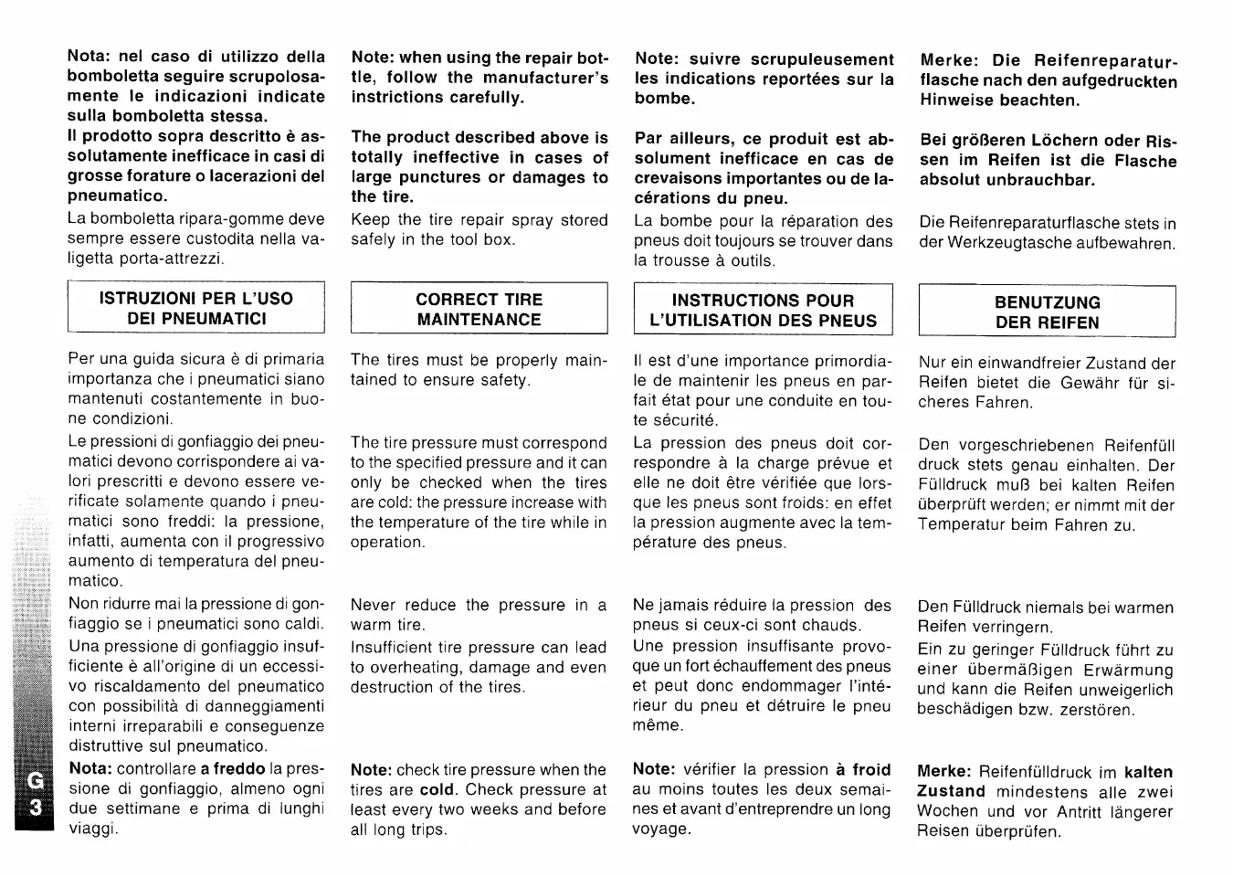 Ferrari F512M - istruzioni per luso dei pneumatici; correct tyre maintenance; instructions pour lutilisation des pneus; benutzung der reifen