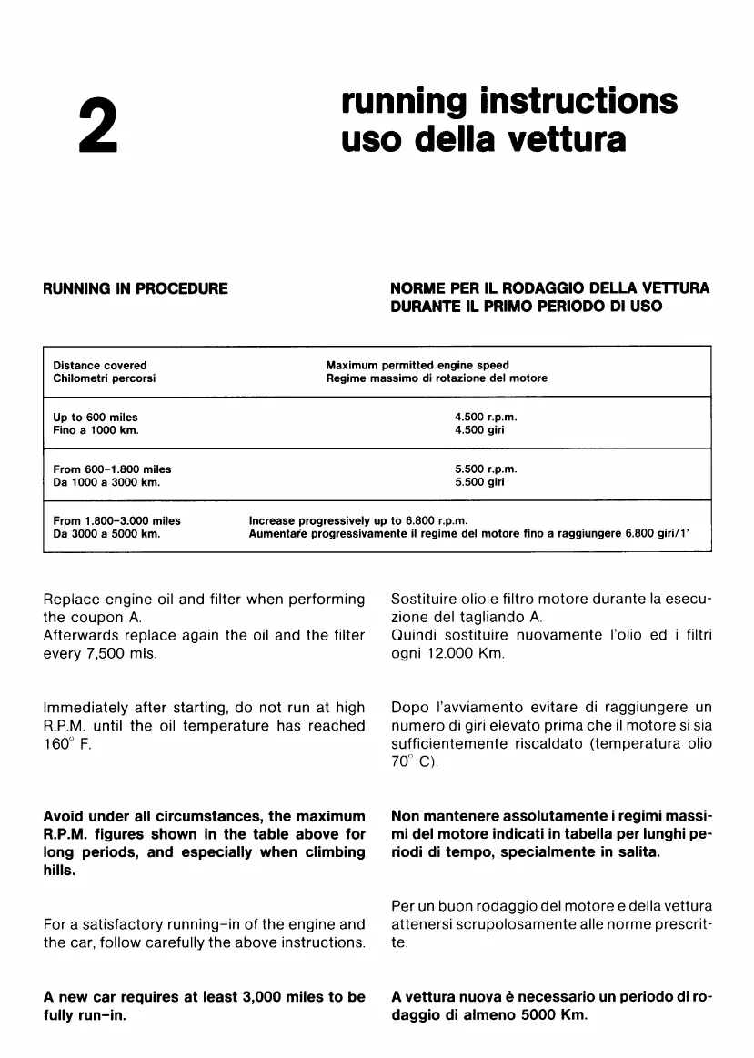 Ferrari Testarossa - Vehicle Operation and Care; RUNNING INSTRUCTIONS
