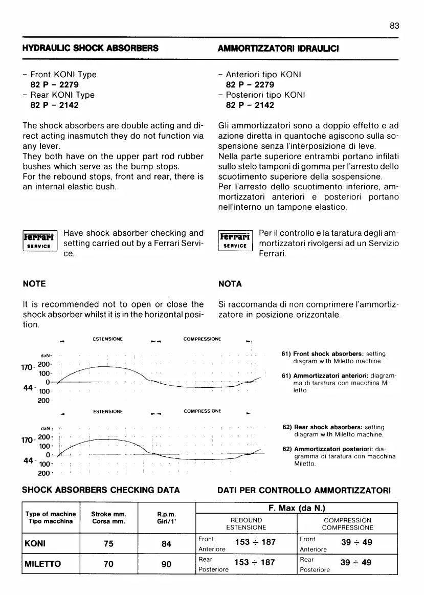 Ferrari Testarossa - Hydraulic Shock Absorbers; Shock Absorbers Checking Data