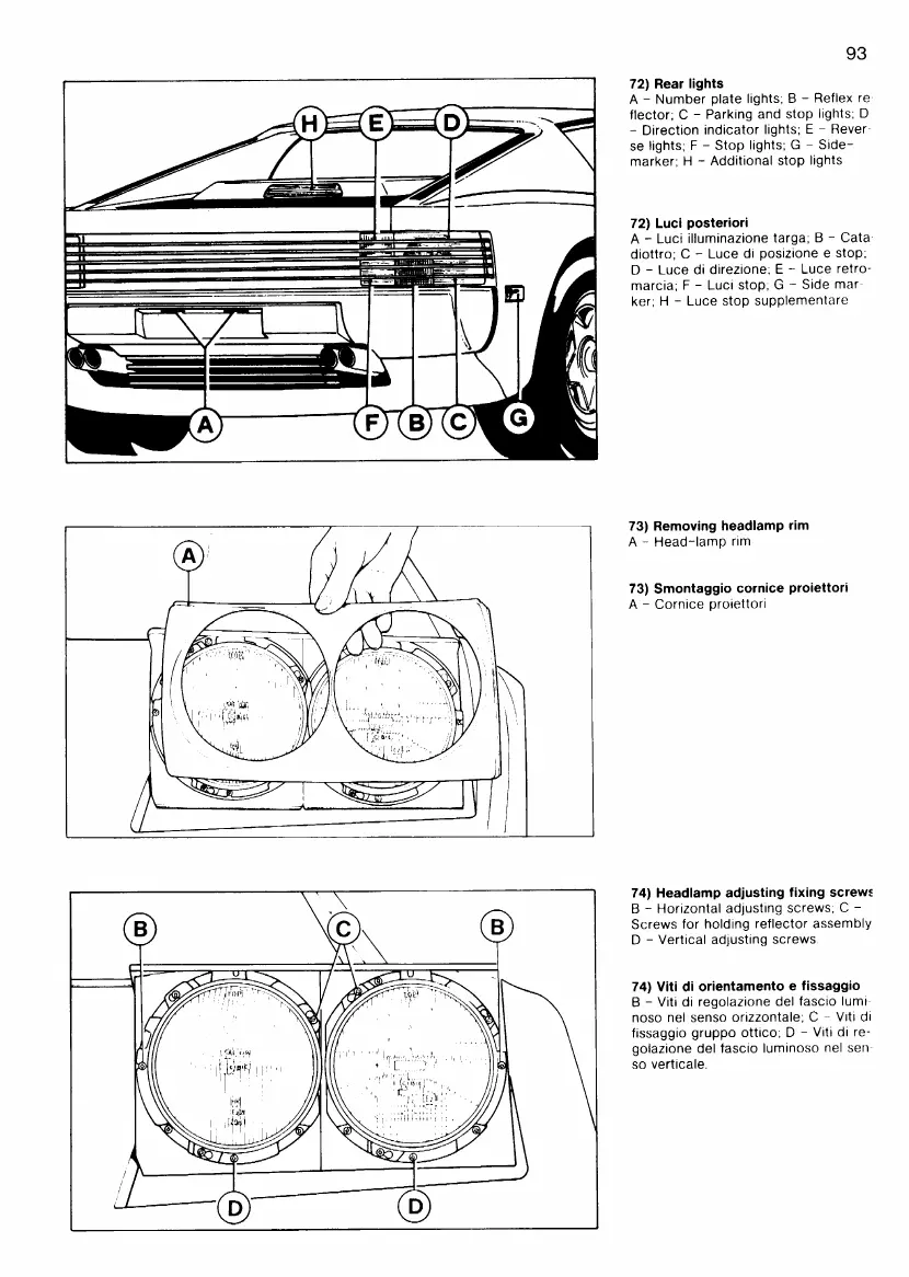 Ferrari Testarossa - Rear Lights Diagram; Removing Headlamp Rim; Headlamp Adjusting Fixing Screws