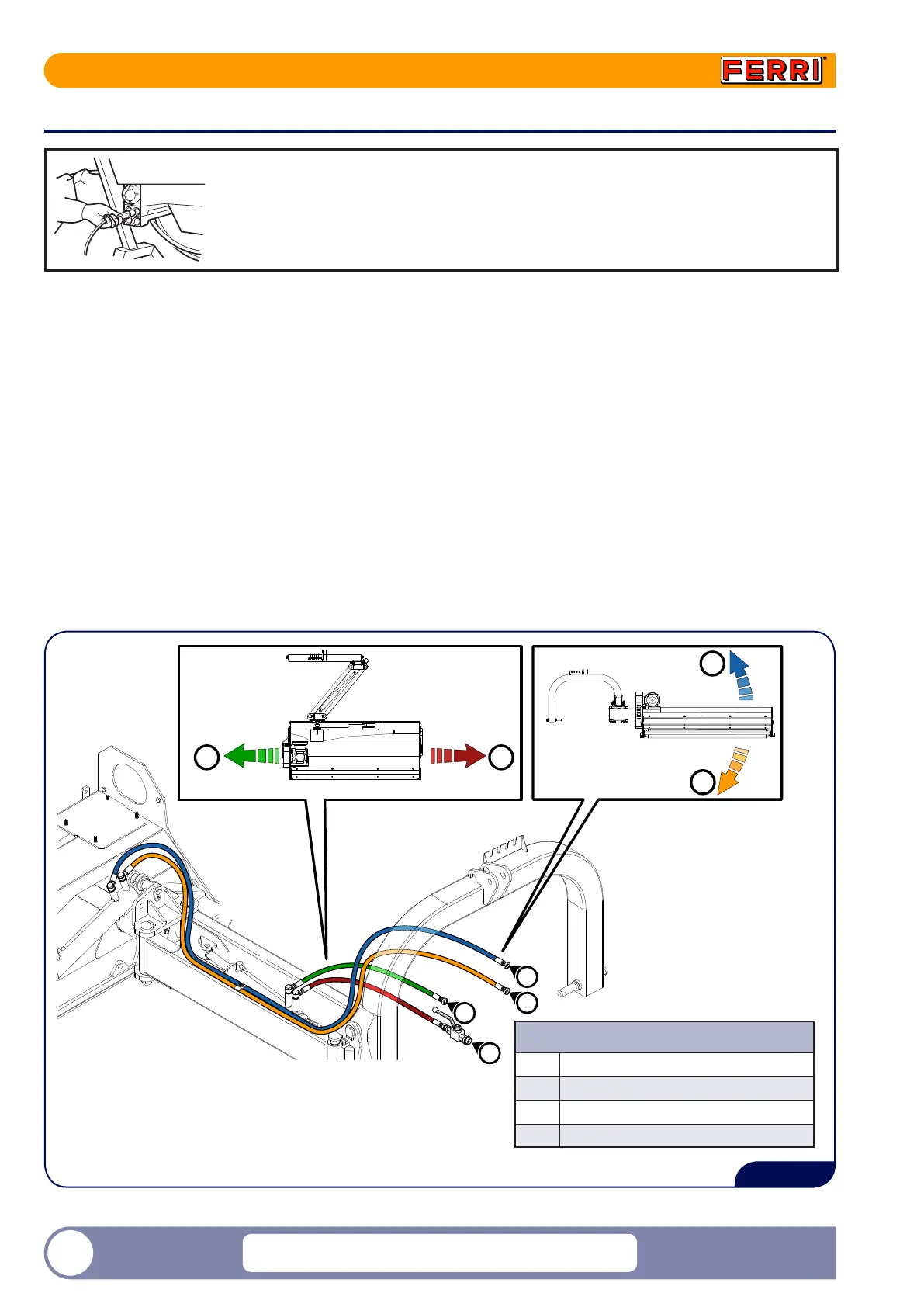 1) Connect the hydraulic hoses with quick hitch on the tractor after having checked that all attachments are clean