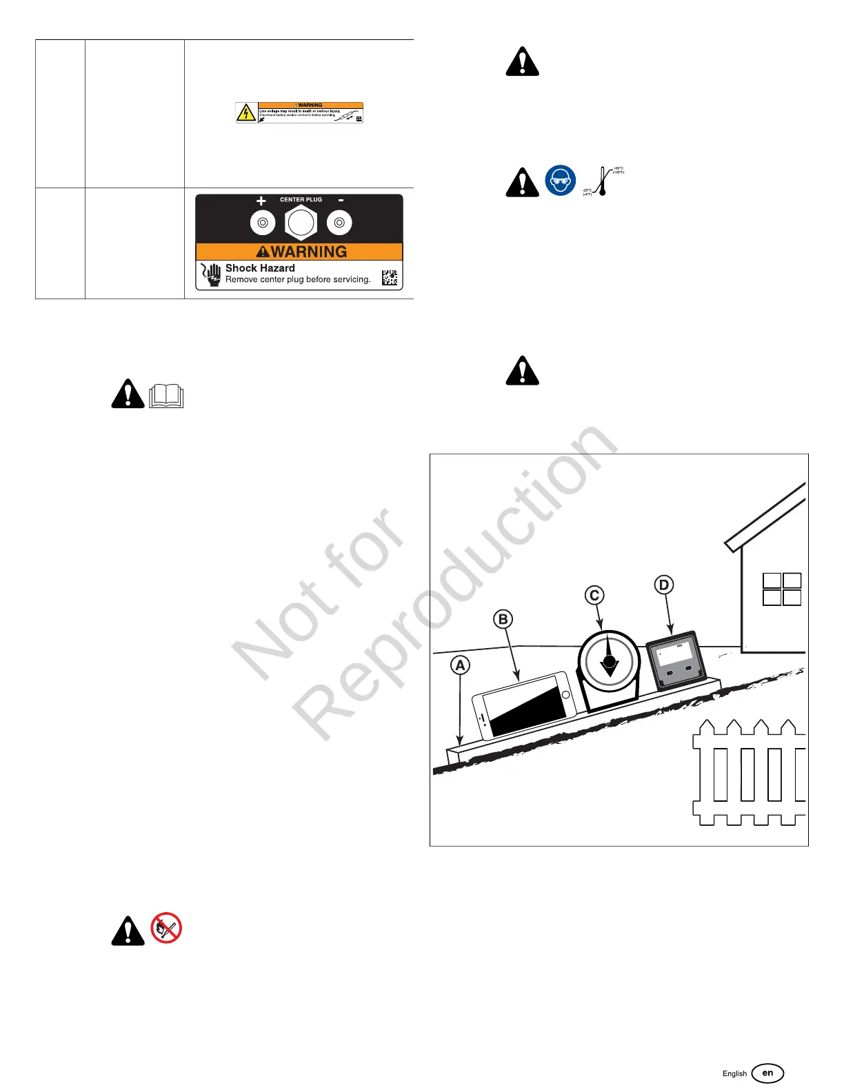 well as on the machine, battery, and attachments, before you
