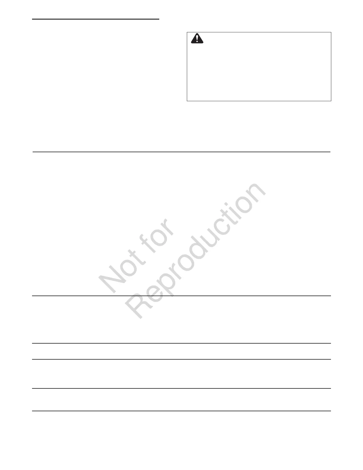 Engine will not turnover or start. 1. Parking brake not engaged. 1. Engage parking brake.