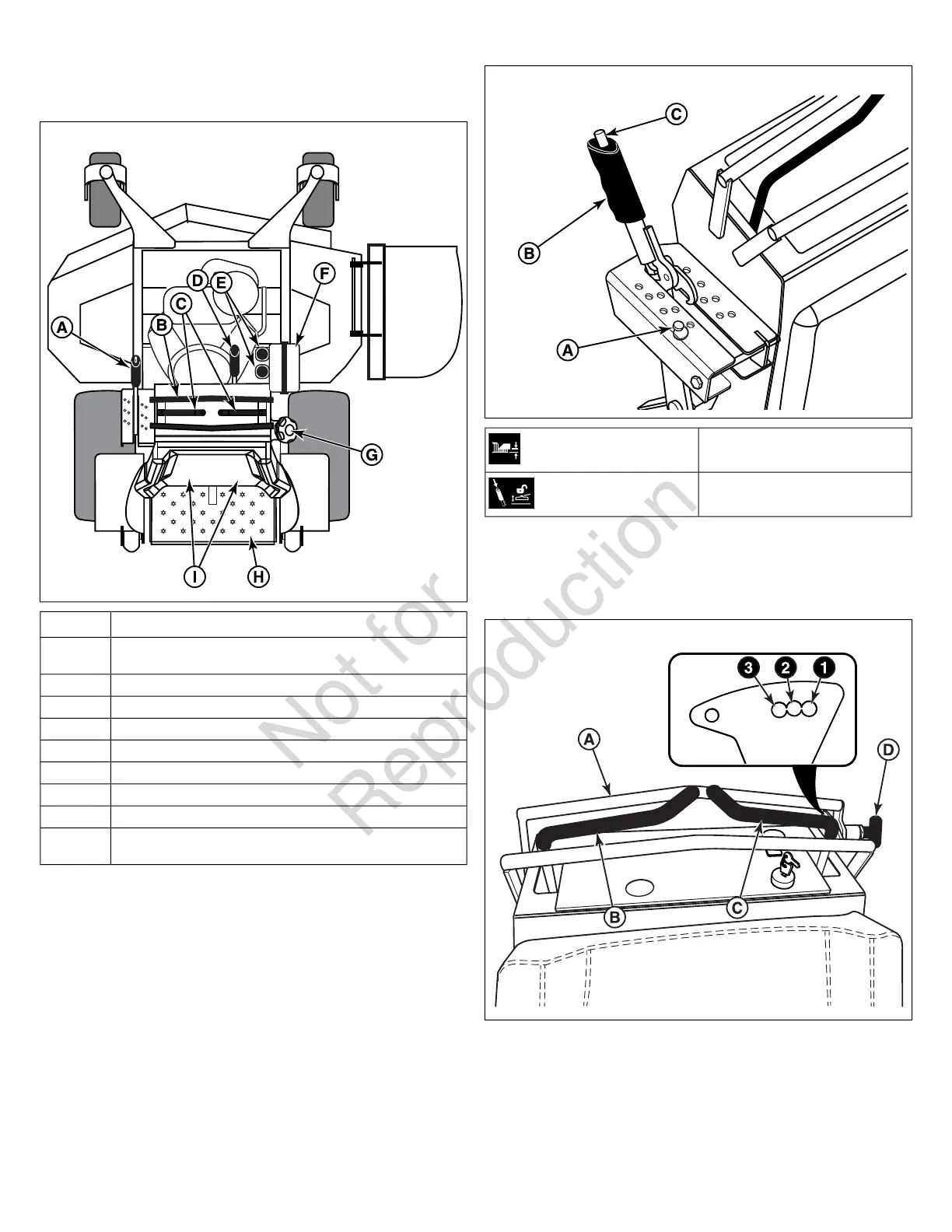 height adjustment pin (A) and deck lift release button (C), are