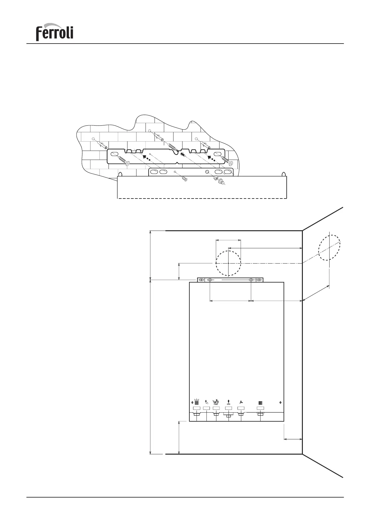Select suitable mounting position for boiler, using the template mark flue outlet and boiler mounting points. Drill