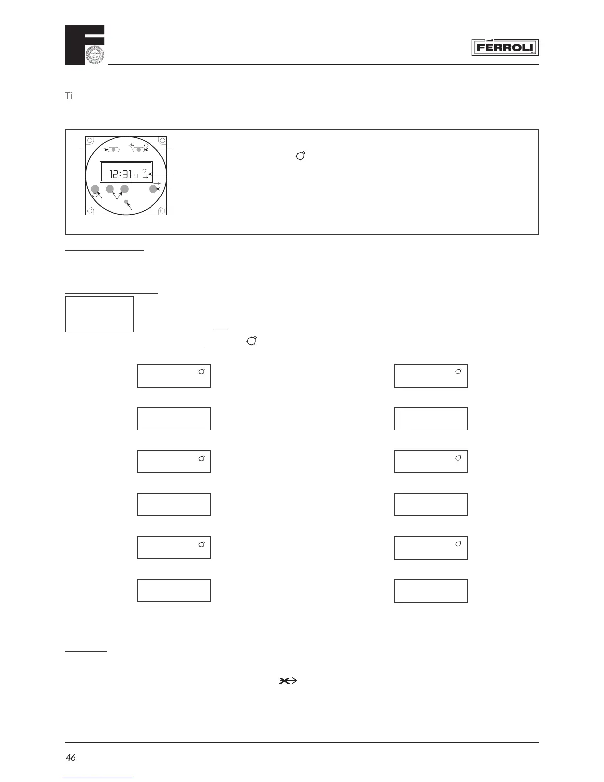 F I=Heating continuous - AUTO=Heating timed - O=Heating disabled