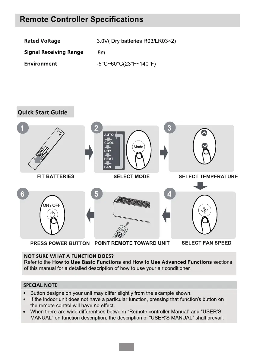 Ferroli GIADA - Remote Controller Specifications; Quick Start Guide