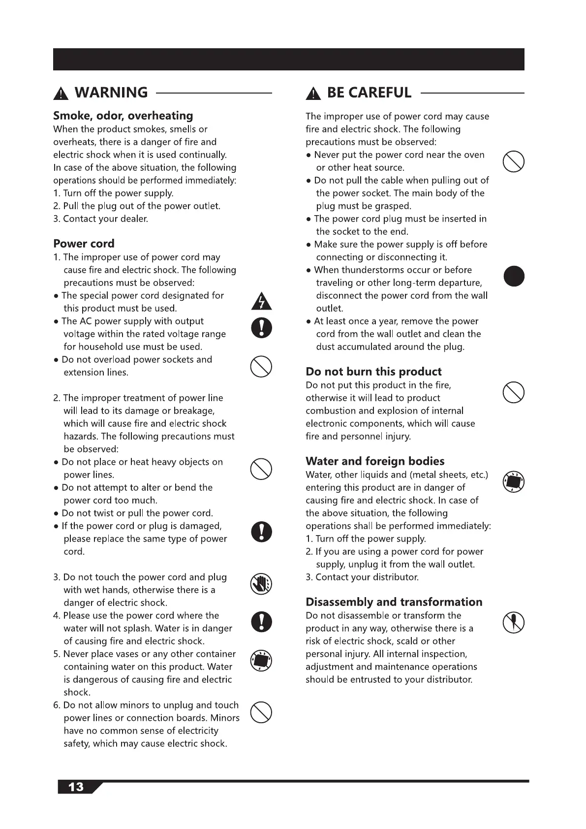 FESLEY FED200 - Smoke, Odor, Overheating; Power Cord Handling; Prohibition of Burning; Water and Foreign Bodies