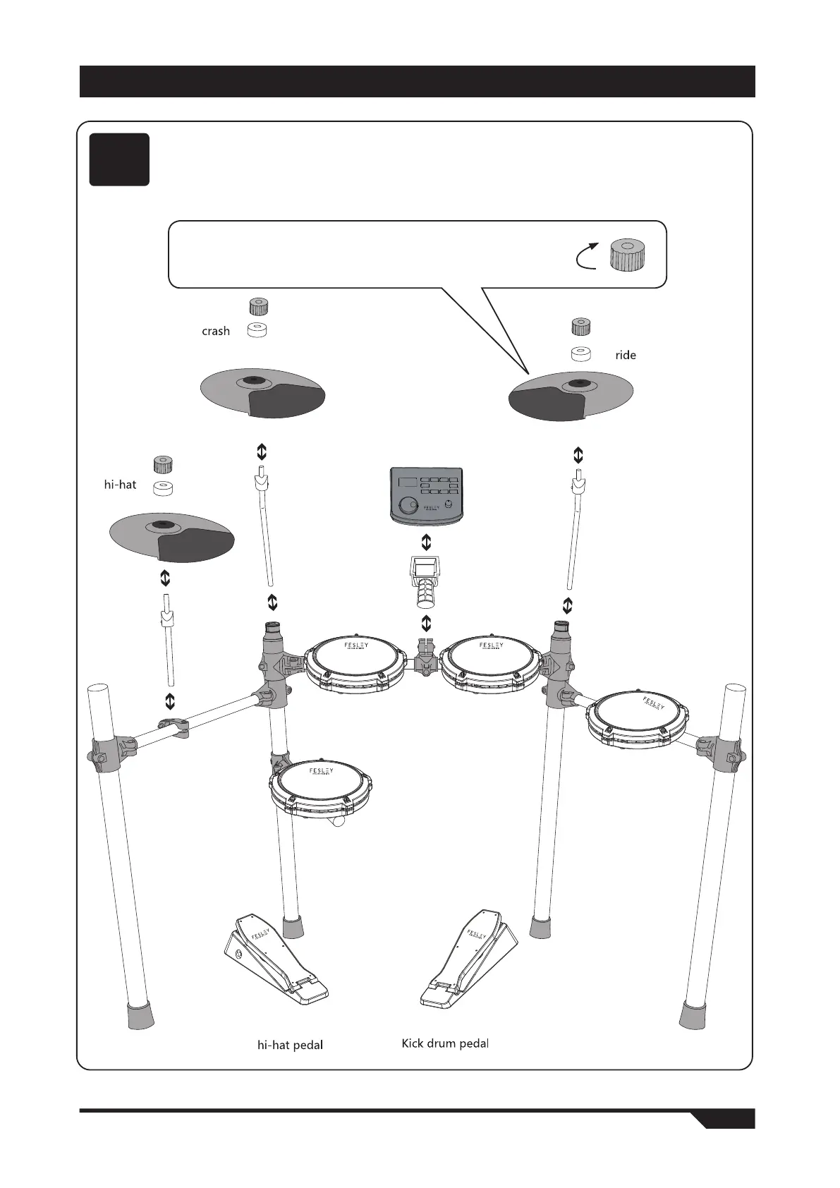 Install cymbals, module, place pedals