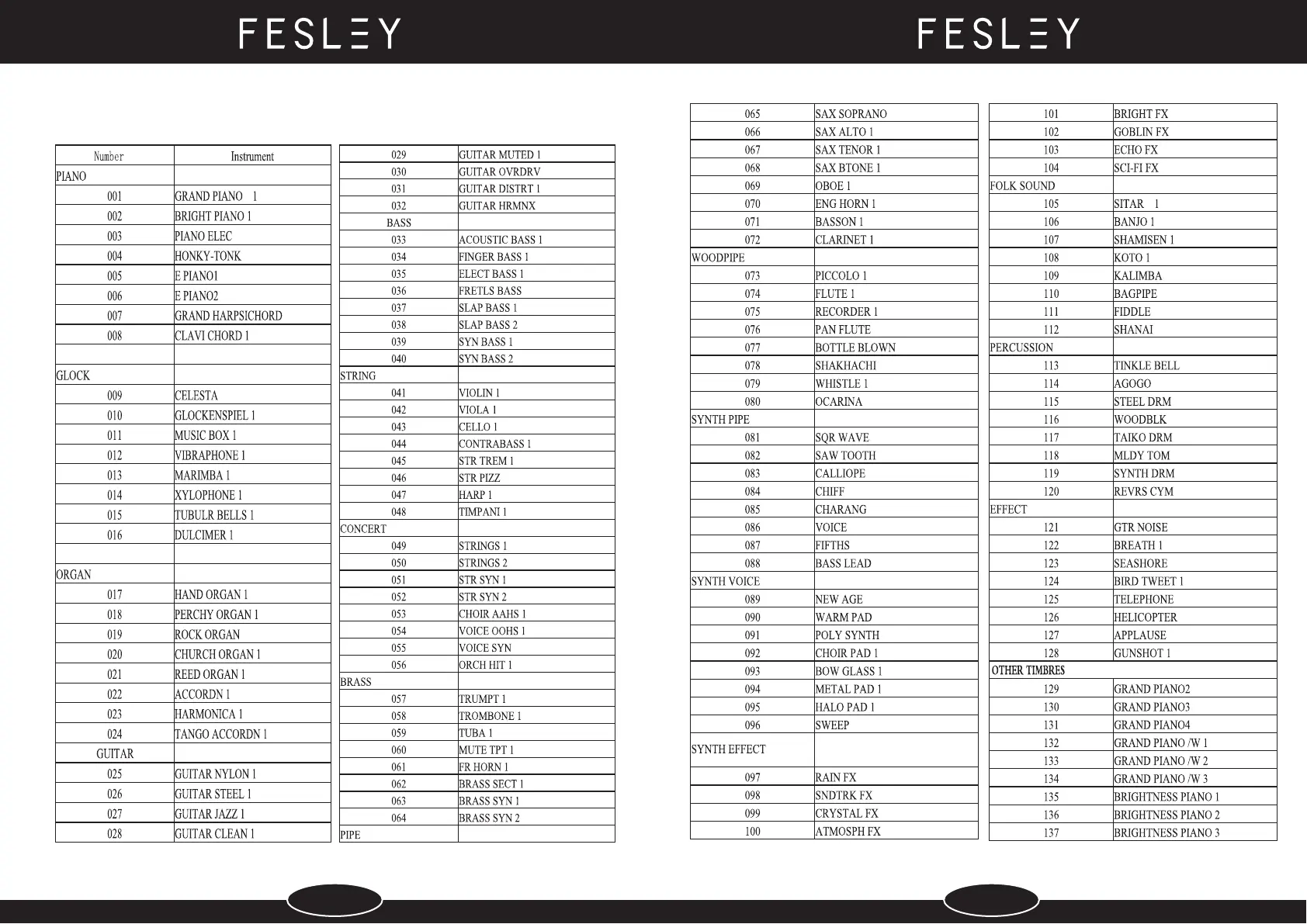 FESLEY FEP1000 - Instrument Tone Lists; Piano, Organ, and Guitar Tones; Synth, Percussion, and Folk Tones