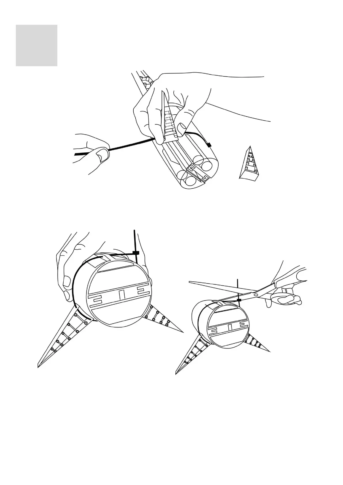 Pass the cable tie through the openings located on the tail fins and also on the corpus