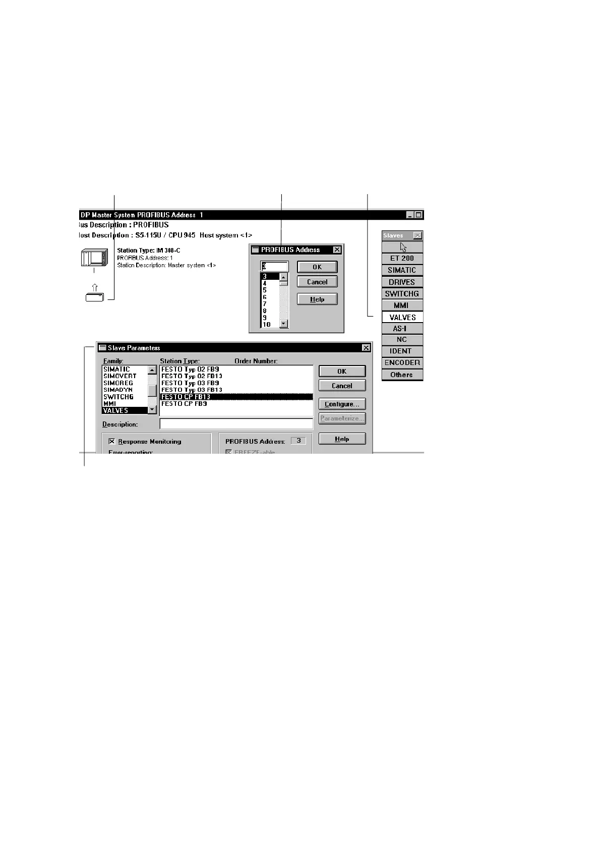 Fig. 2/6: Station selection with COM PROFIBUS 3.x (the masks shown are not all visible