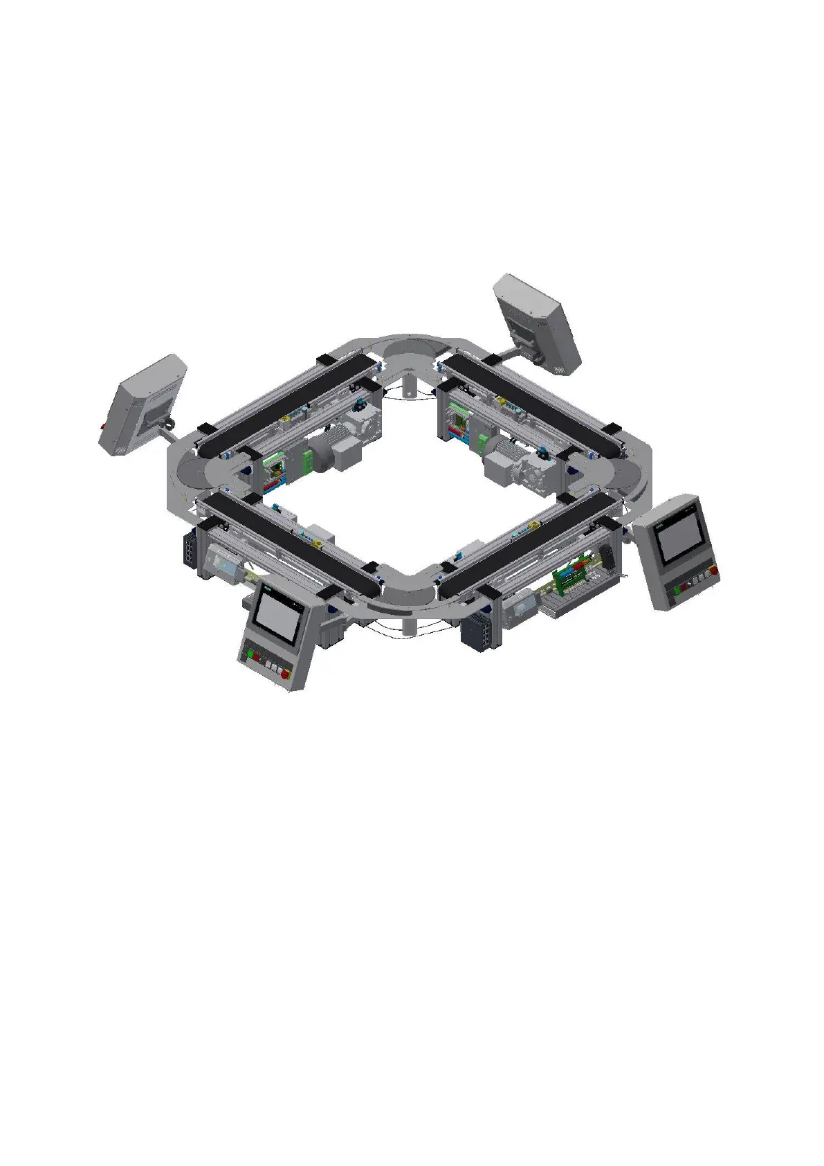 the rectangle and to connect the conveyors with active corners. A motor drives the corner and the carrier is