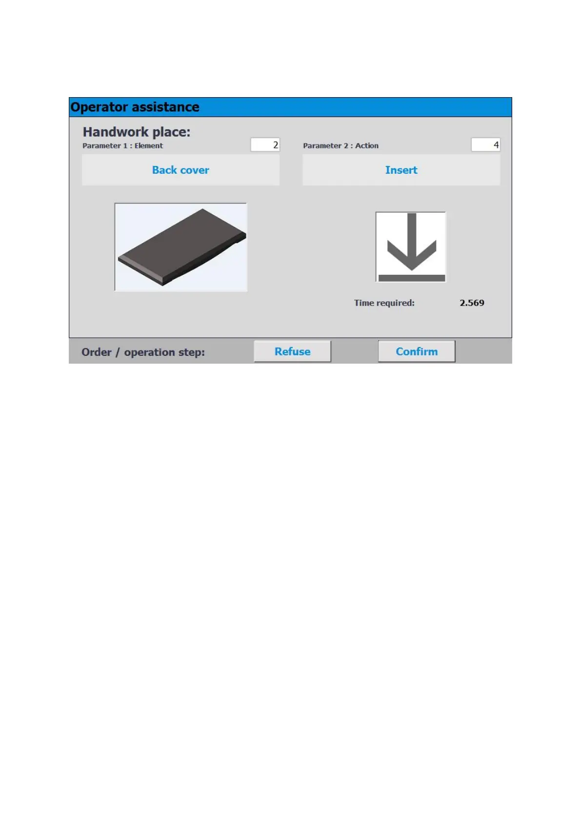 3. In this case, element 2 and action 4 are specified in the transitions. The worker must insert a backcover.