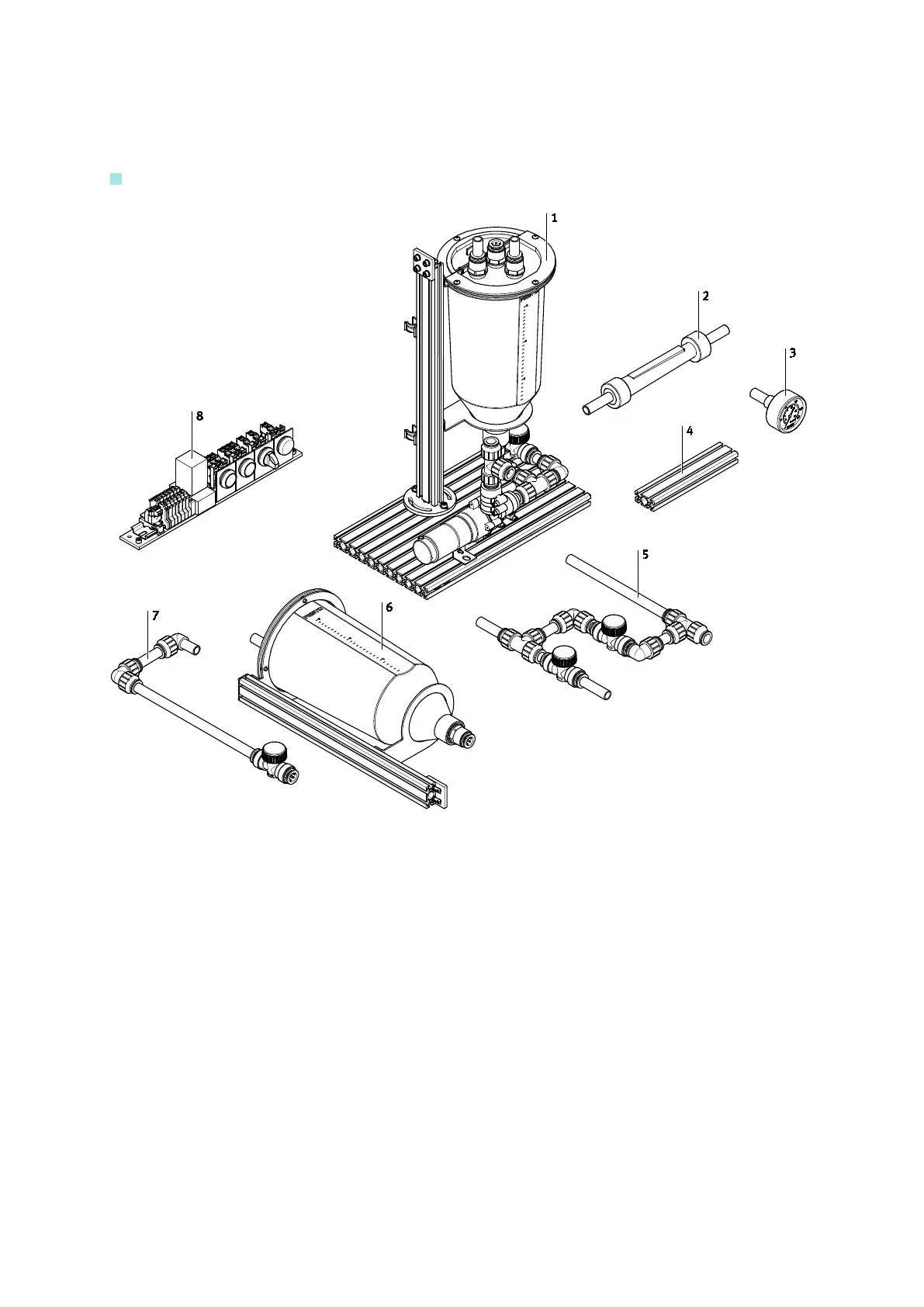 1: Placa perfilada, tubos, empalmes, válvulas de palanca manual y depósito inferior